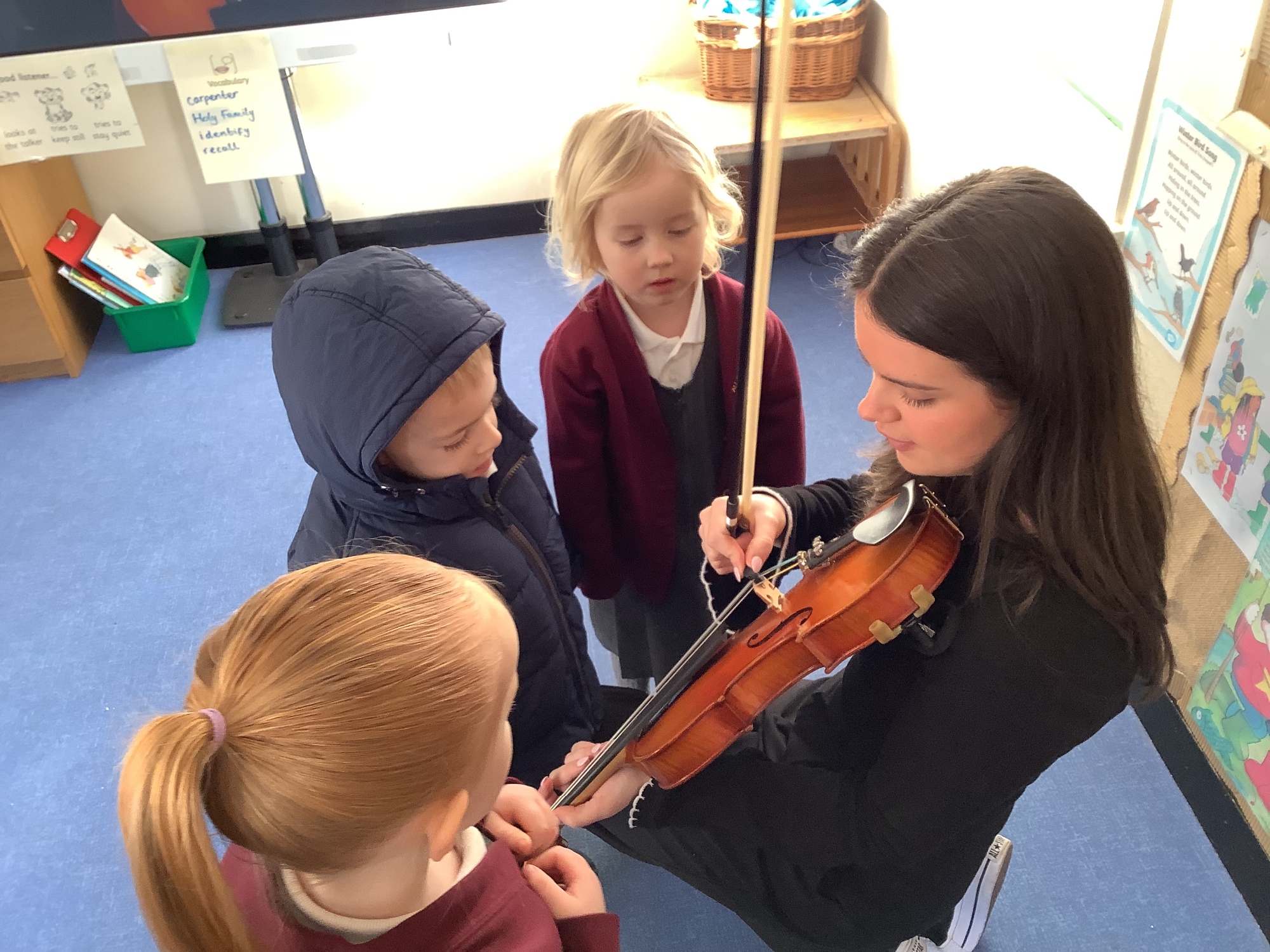 In Nursery, we’ve been thoroughly enjoying a wonderful ten-part series featuring the BBC Philharmonic orchestra, which brings famous stories from around the world to life through the power of music. We  have listened to tales such as Jack and the Beanstalk and The Three Billy Goats Gruff, discovering how different instruments can be used to create mood, excitement, and character within a story. Inspired by this, we were delighted to have our very own live concert in Nursery this week! Martha kindly brought in her violin and played some beautiful music for us, the children were absolutely amazed. We found out about the different parts of the violin, how it is played and why it is so important to handle instruments carefully and with respect. It was a fantastic musical experience that truly captured the children’s imagination. 🎻✨