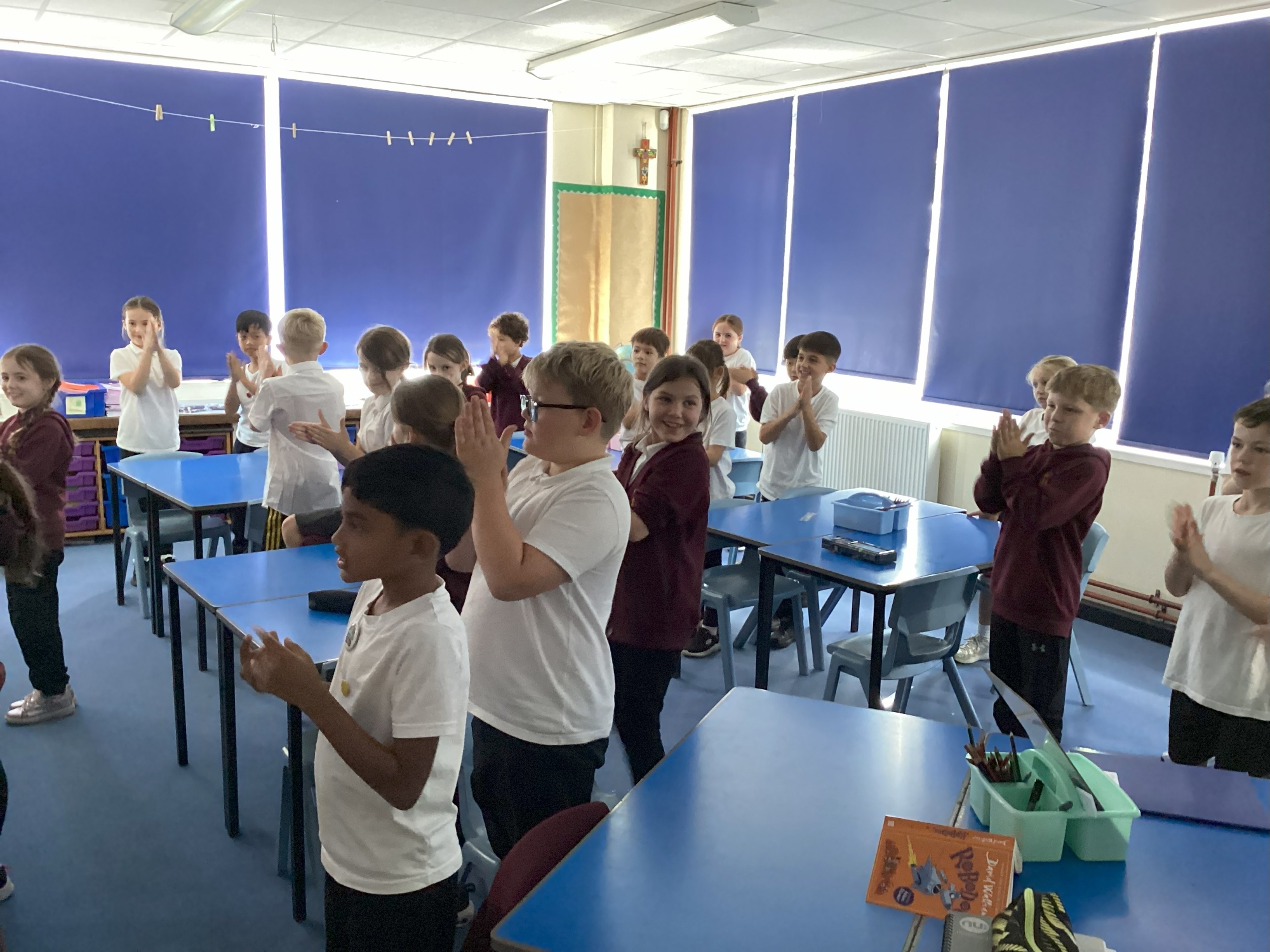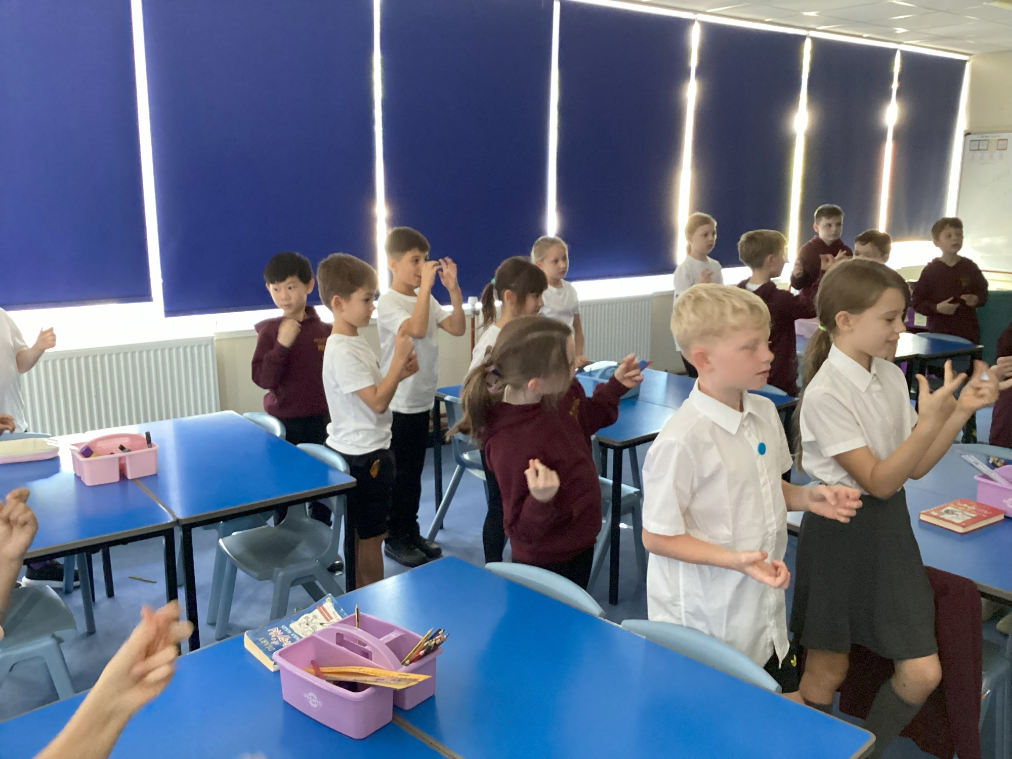 Year 4 are working on a rainforest theme for their music lesson. They are starting to identify the texture and structure of a piece of music, and then they are developing some body percussion based on the Rainforest theme. They are certainly having fun working in groups.