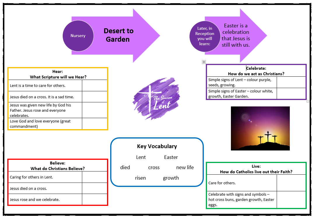 We will also celebrate with familiar signs such as hot cross buns and Easter eggs, helping the children to understand that Lent is a time to care for others and that Easter is a joyful celebration of new life and hope.