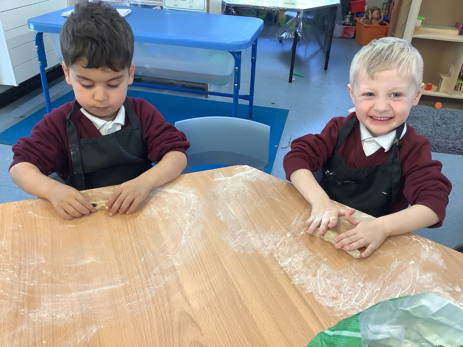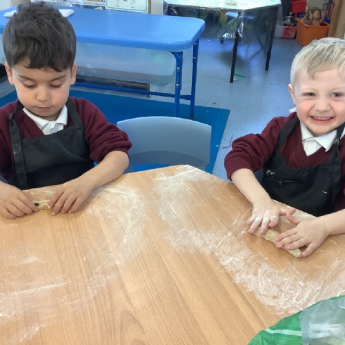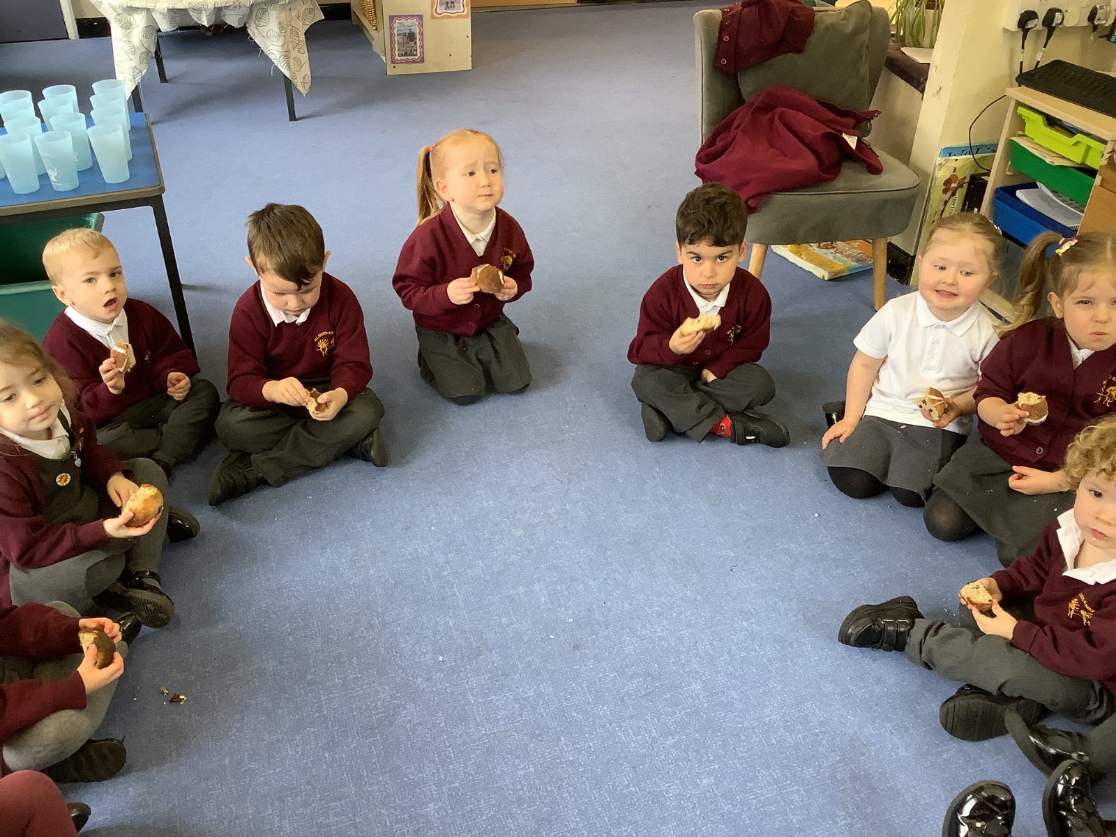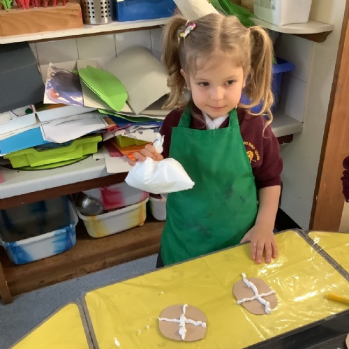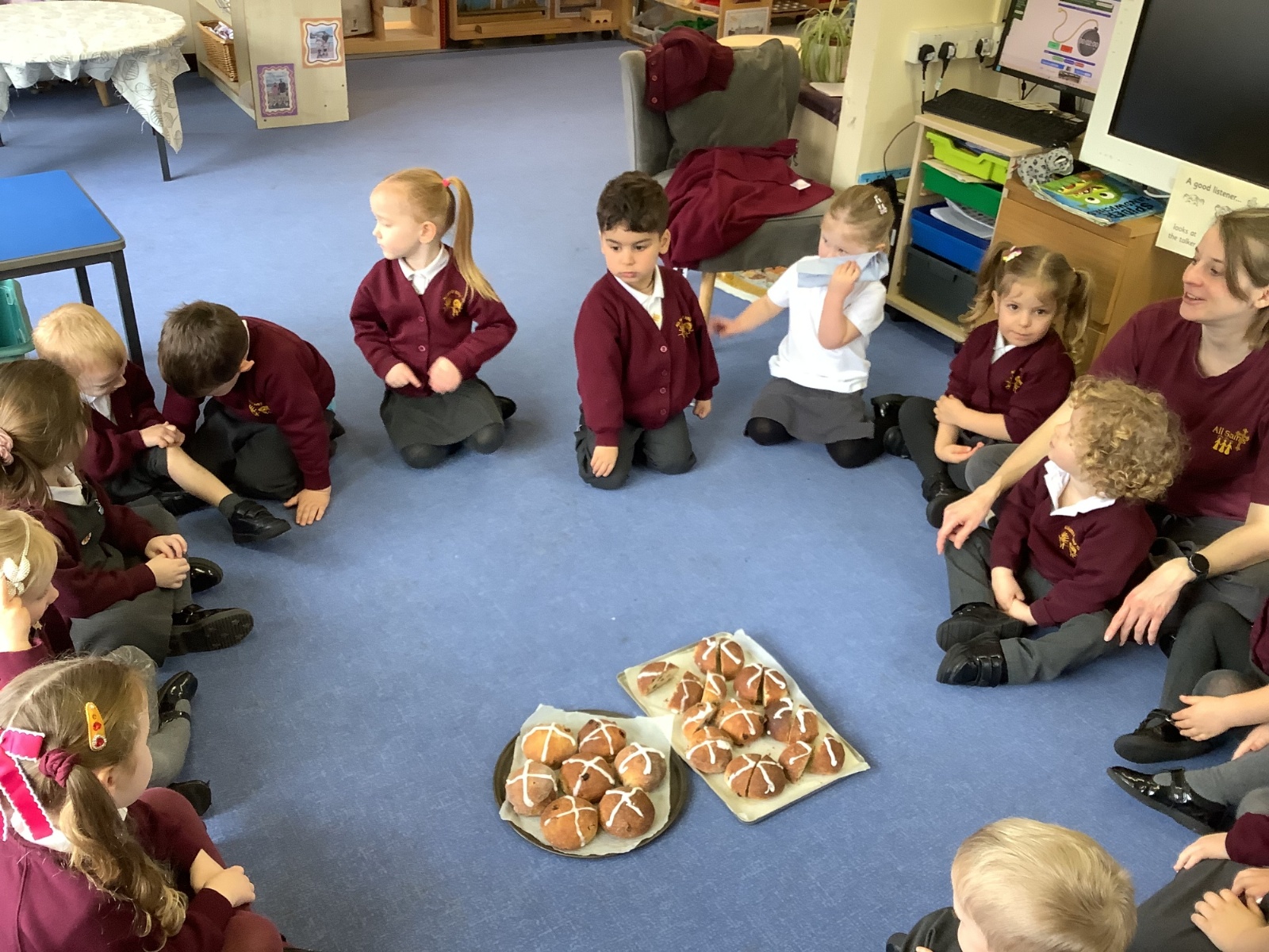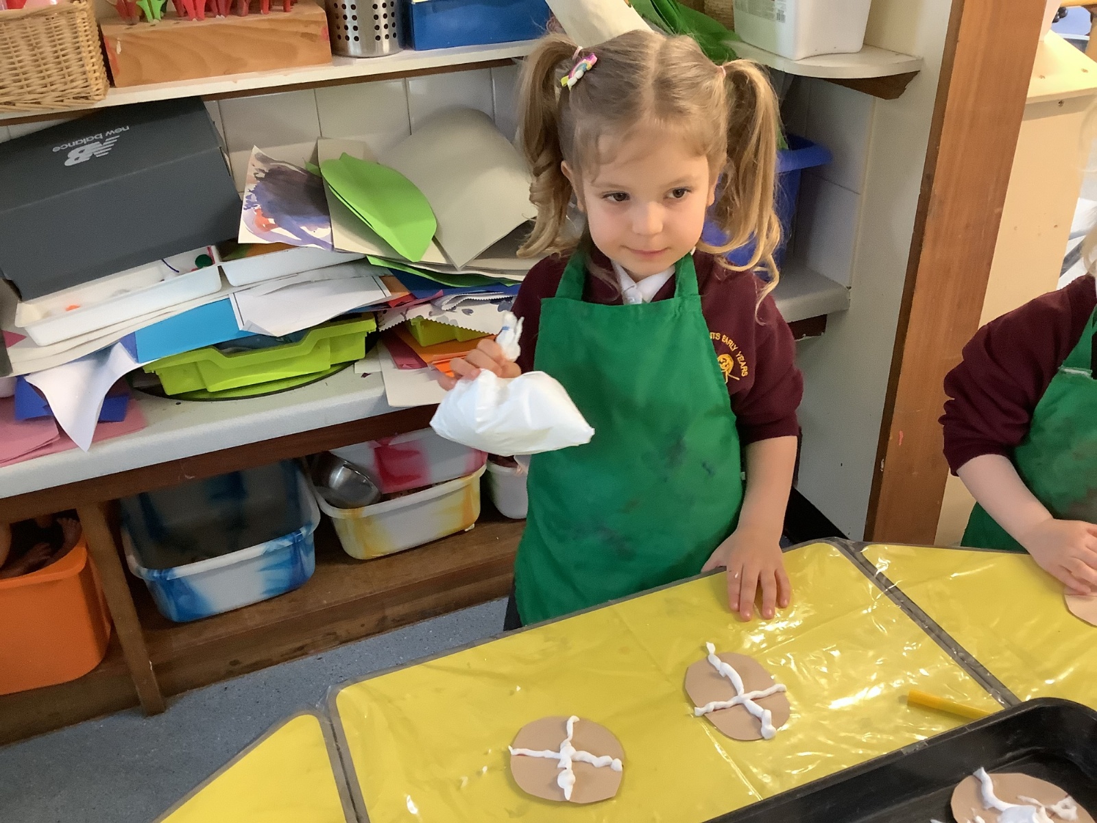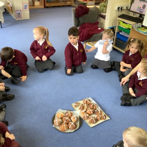 This week in Nursery we had great fun making our own hot cross buns! The children enjoyed helping to mix the ingredients, shape the dough and add the special cross on the top. As we baked, we talked about why hot cross buns have a cross and how it reminds Christians of Jesus dying on the cross for us at Easter. The children were very excited to see their buns come out of the oven, and they loved tasting the delicious treats they had made together! We even had a practice at making crosses on paper using shaving foam, which the children loved exploring with their hands.
