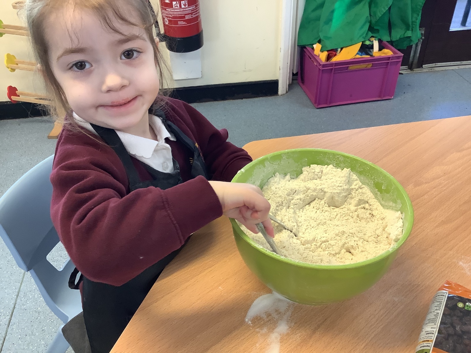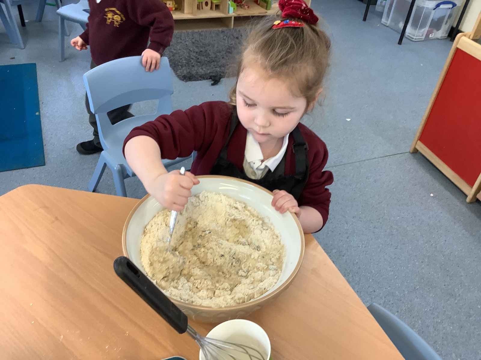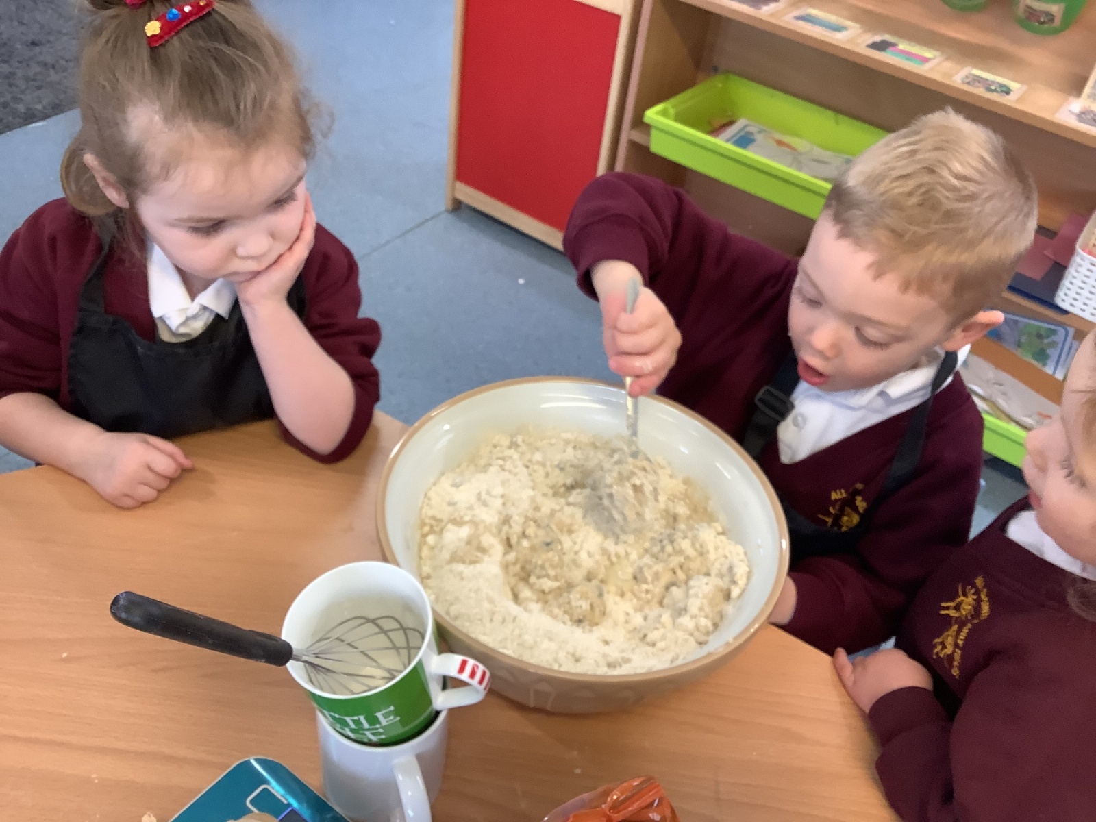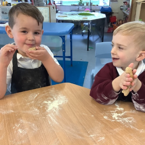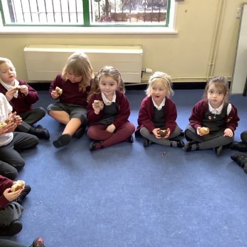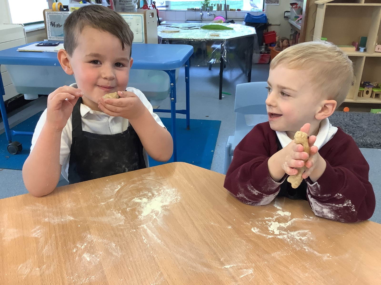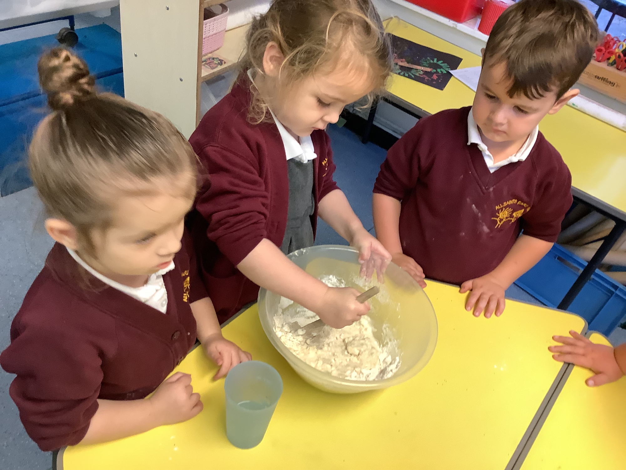 This week in Nursery we had great fun making our own hot cross buns! The children enjoyed helping to mix the ingredients, shape the dough and add the special cross on the top. As we baked, we talked about why hot cross buns have a cross and how it reminds Christians of Jesus dying on the cross for us at Easter. The children were very excited to see their buns come out of the oven, and they loved tasting the delicious treats they had made together! We even had a practice at making crosses on paper using shaving foam, which the children loved exploring with their hands.