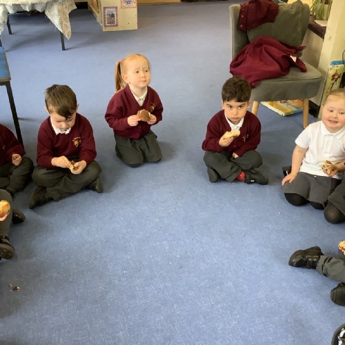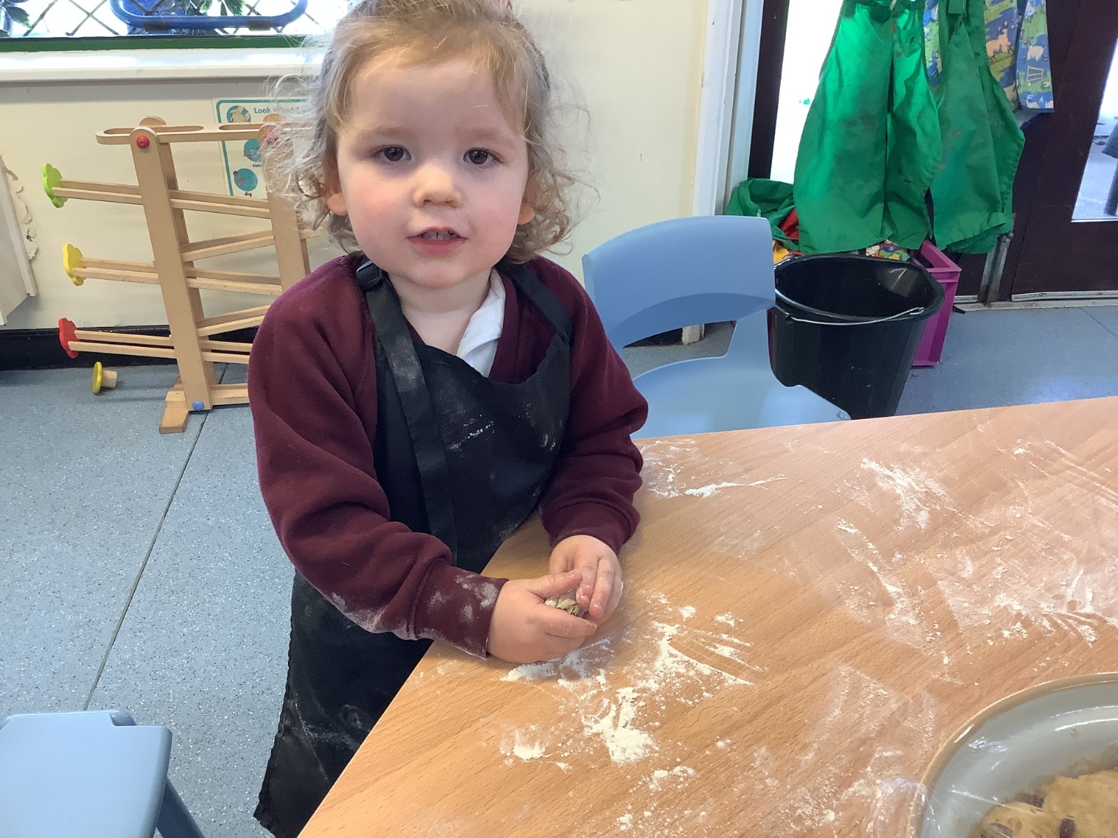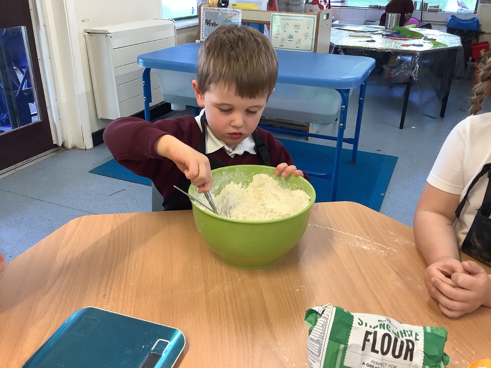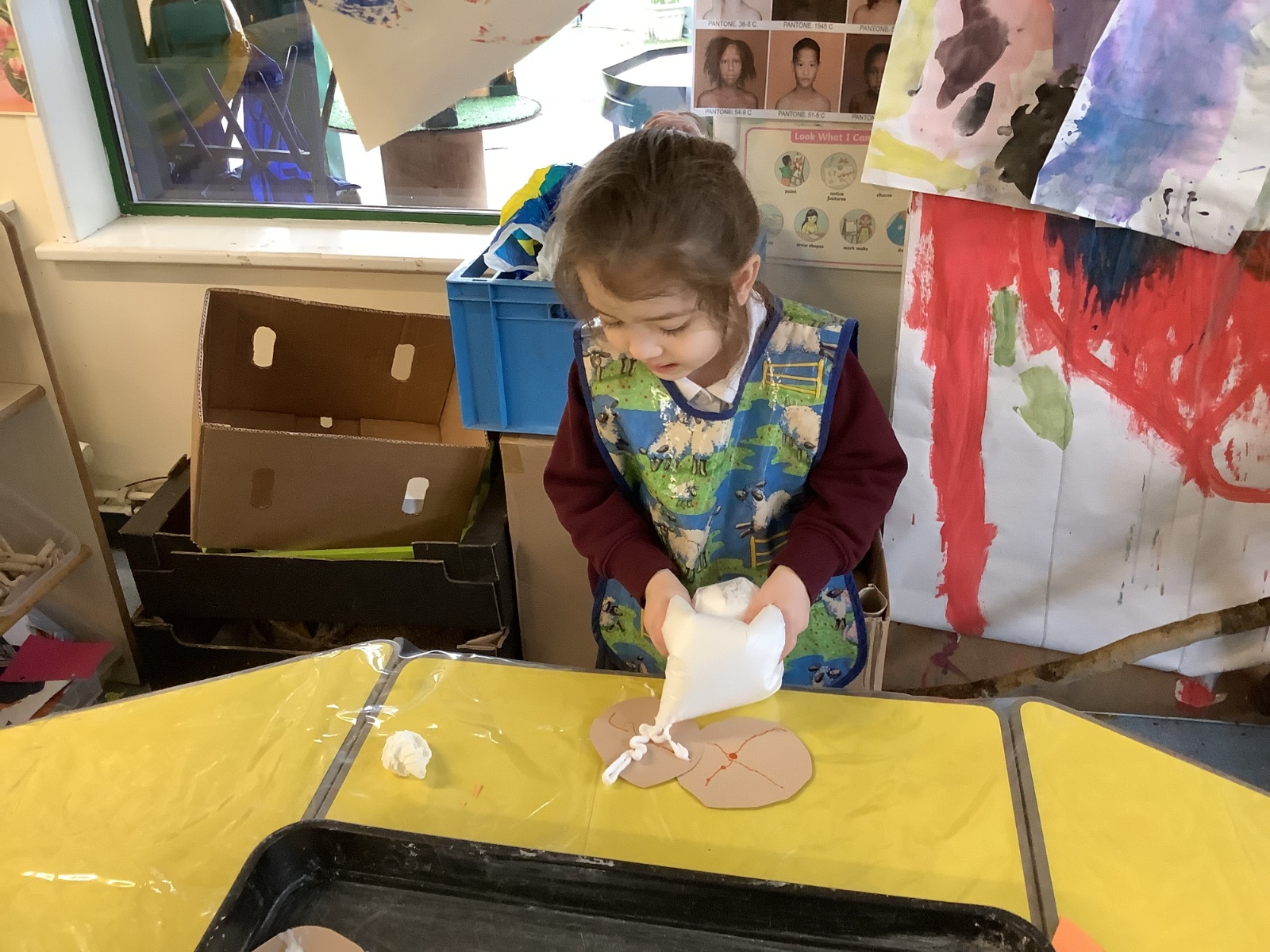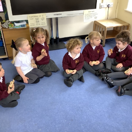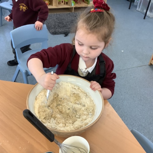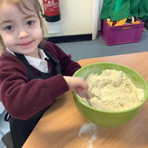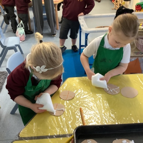 This week in Nursery we had great fun making our own hot cross buns! The children enjoyed helping to mix the ingredients, shape the dough and add the special cross on the top. As we baked, we talked about why hot cross buns have a cross and how it reminds Christians of Jesus dying on the cross for us at Easter. The children were very excited to see their buns come out of the oven, and they loved tasting the delicious treats they had made together! We even had a practice at making crosses on paper using shaving foam, which the children loved exploring with their hands.