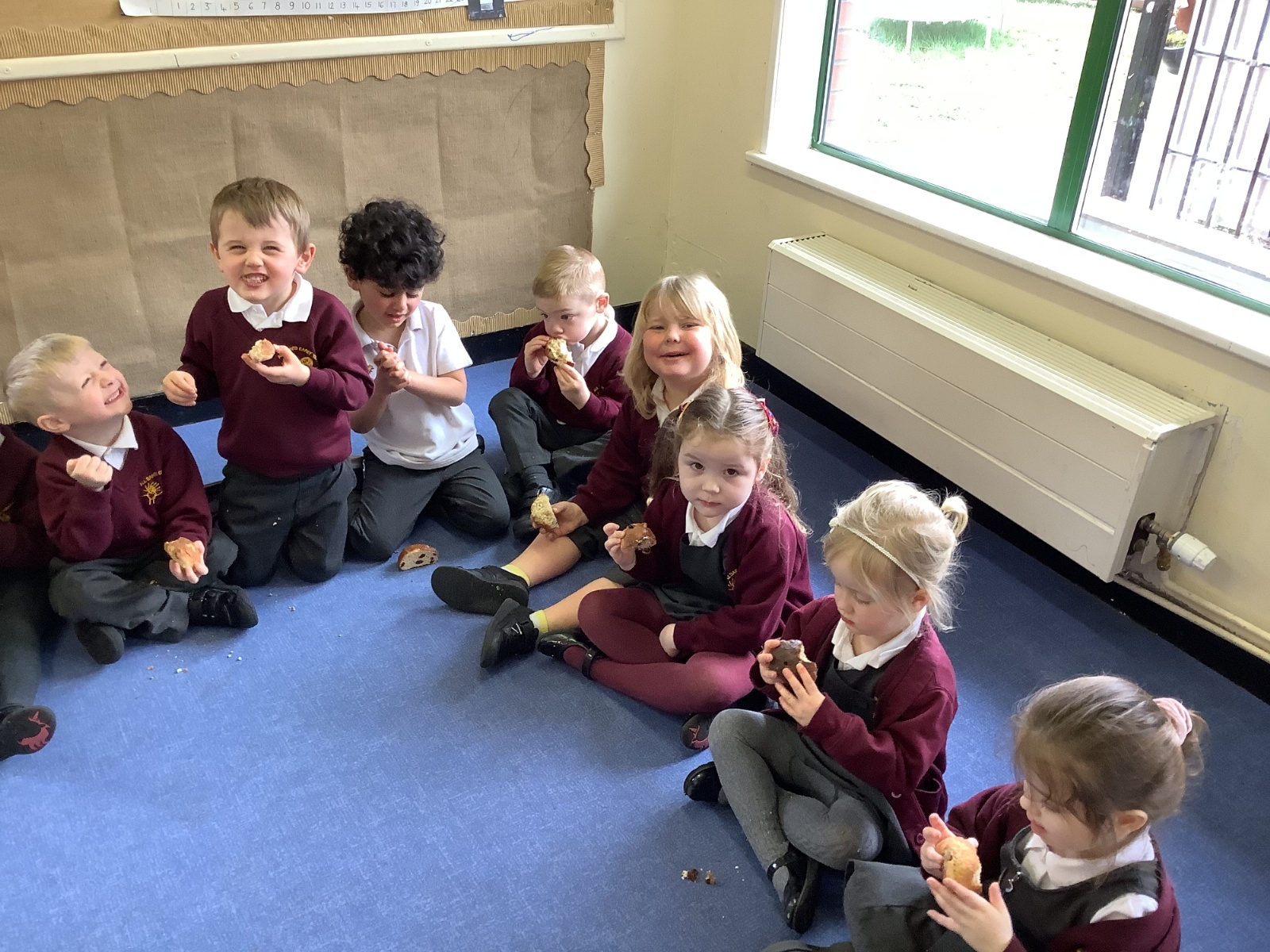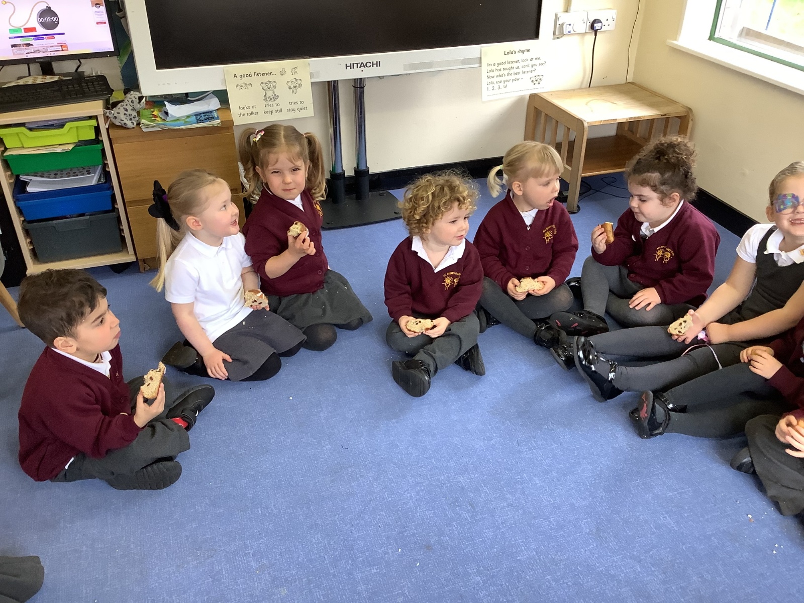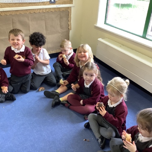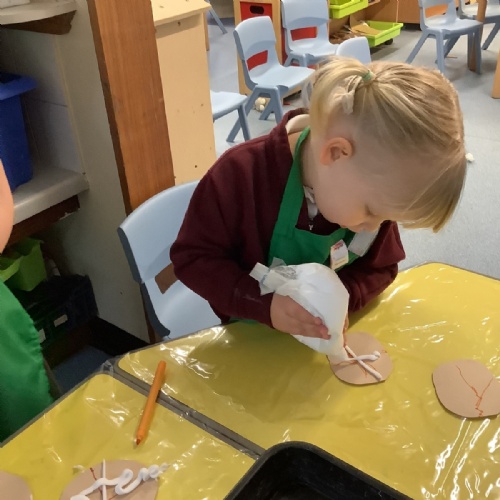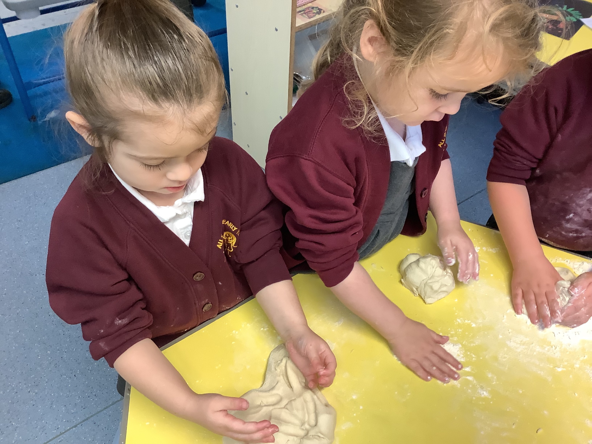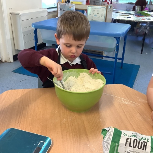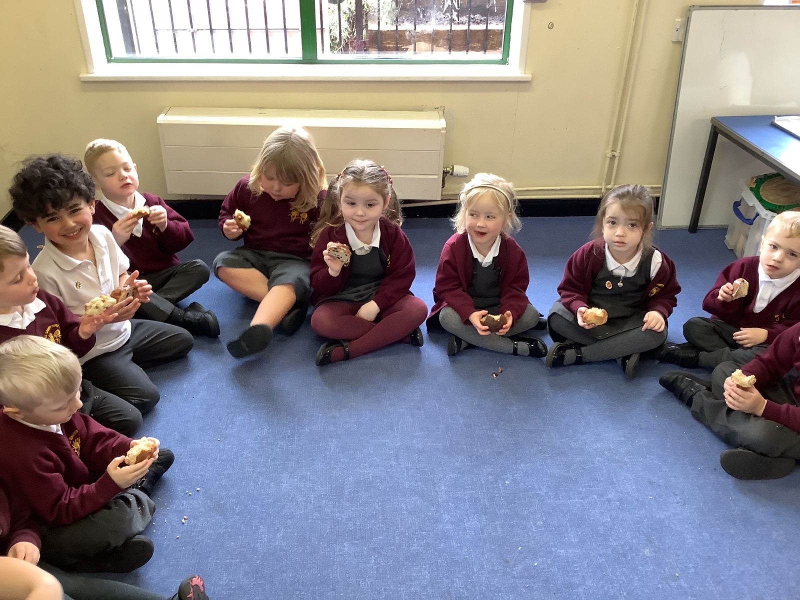 This week in Nursery we had great fun making our own hot cross buns! The children enjoyed helping to mix the ingredients, shape the dough and add the special cross on the top. As we baked, we talked about why hot cross buns have a cross and how it reminds Christians of Jesus dying on the cross for us at Easter. The children were very excited to see their buns come out of the oven, and they loved tasting the delicious treats they had made together! We even had a practice at making crosses on paper using shaving foam, which the children loved exploring with their hands.