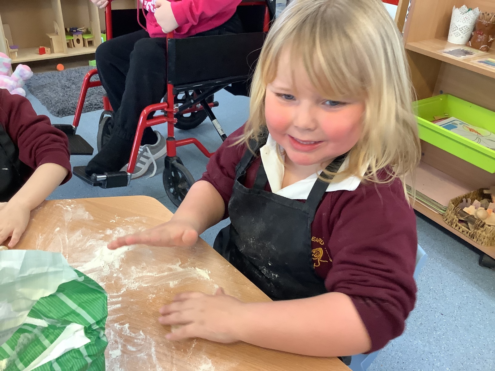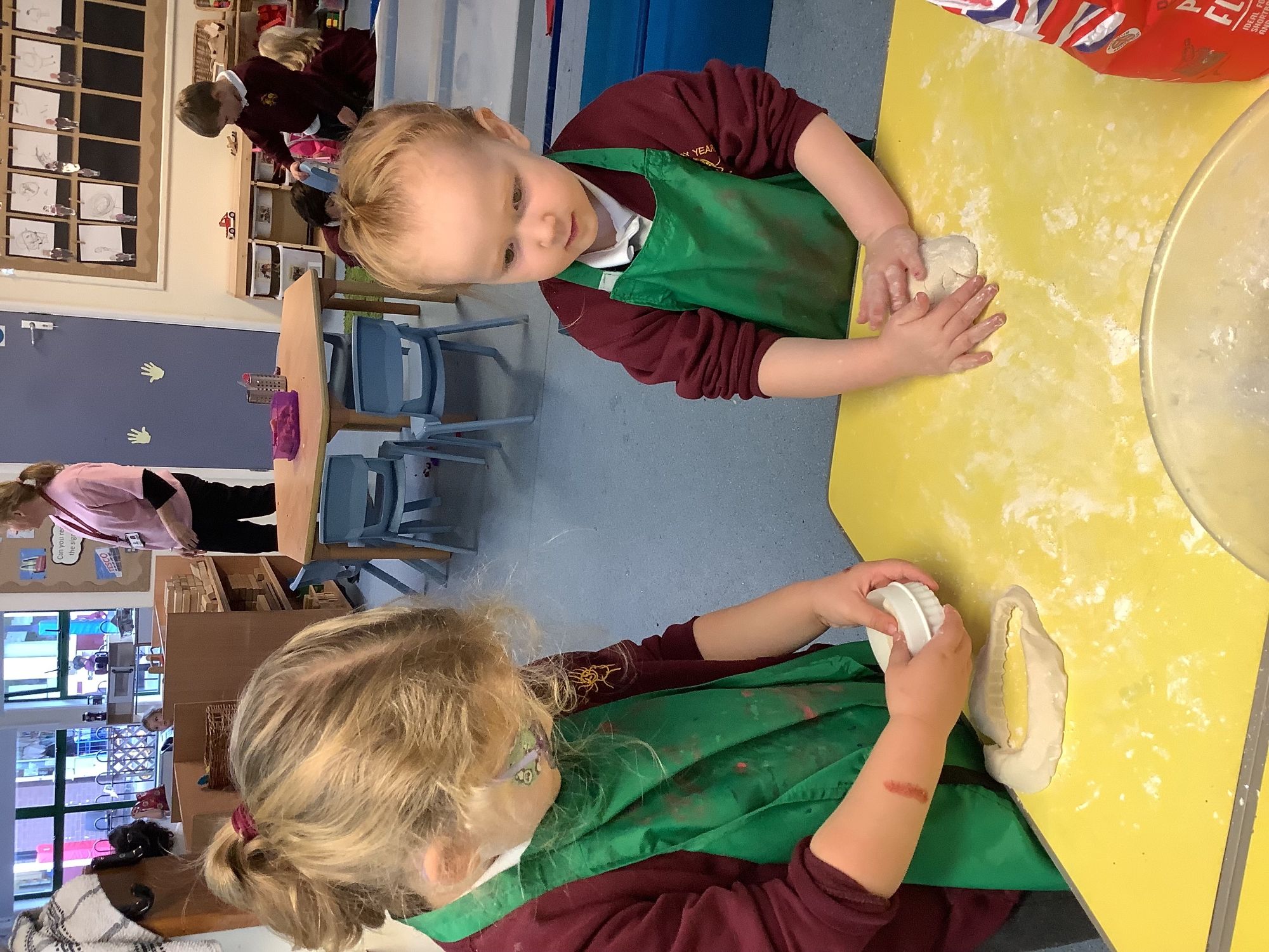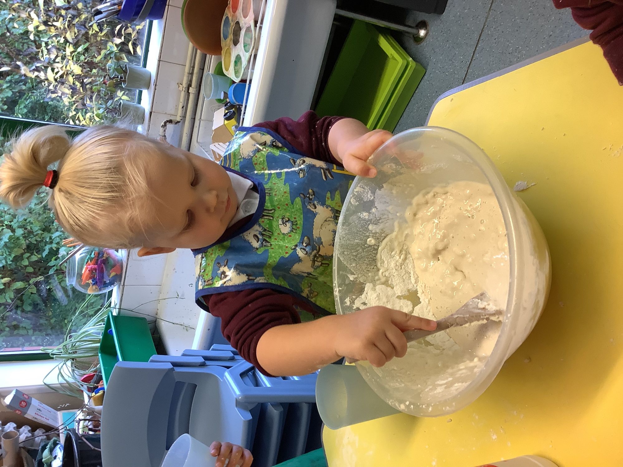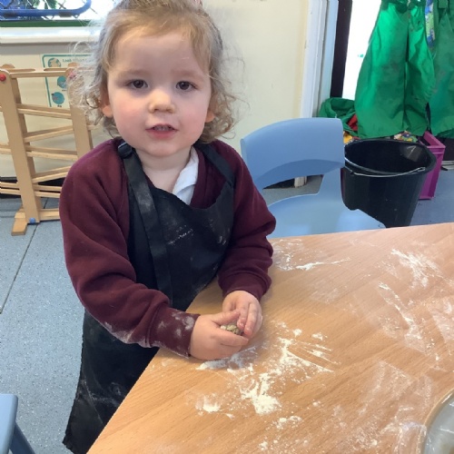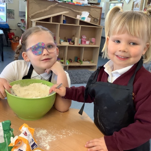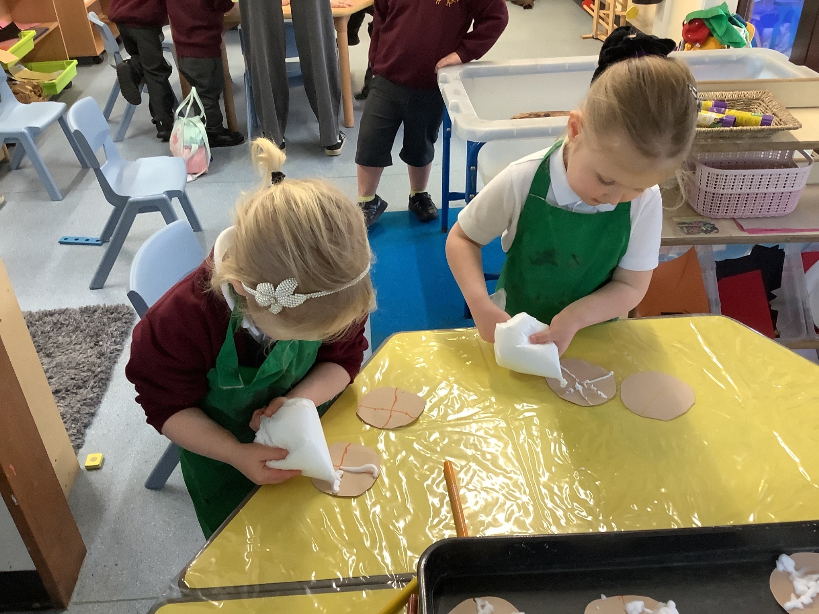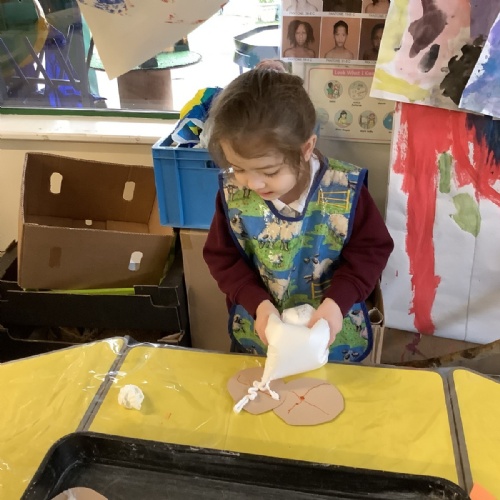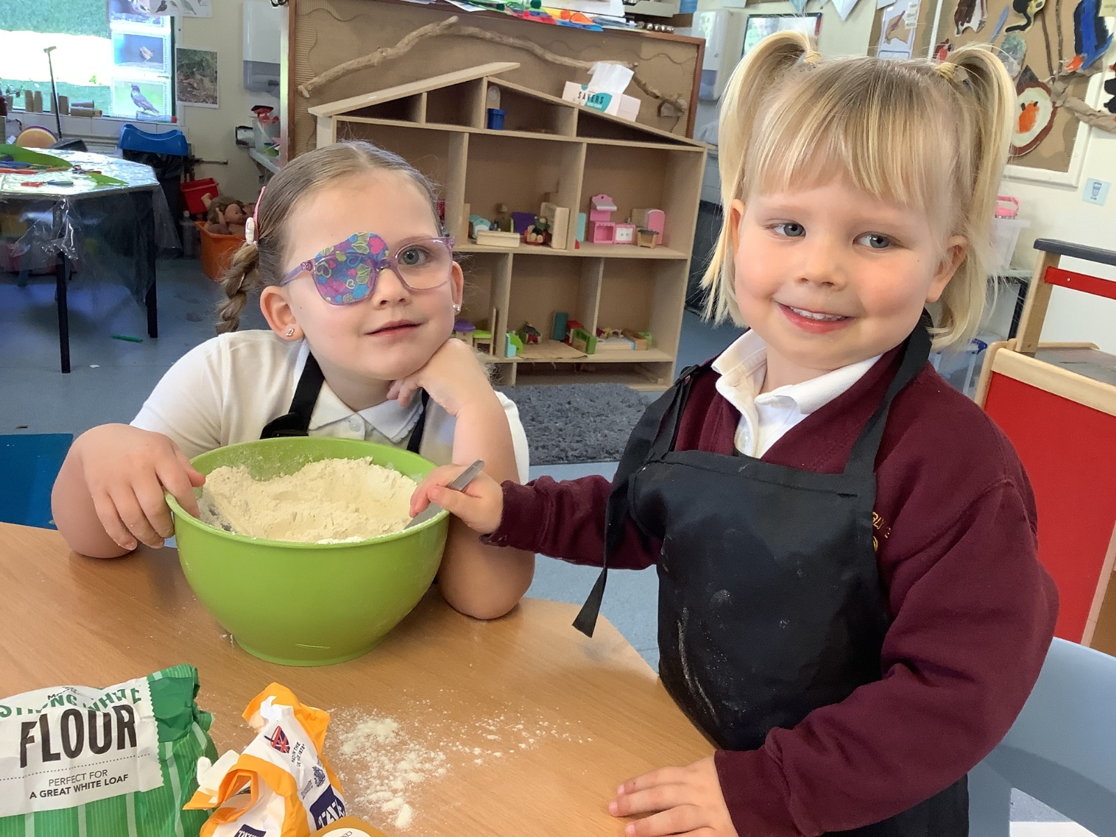 This week in Nursery we had great fun making our own hot cross buns! The children enjoyed helping to mix the ingredients, shape the dough and add the special cross on the top. As we baked, we talked about why hot cross buns have a cross and how it reminds Christians of Jesus dying on the cross for us at Easter. The children were very excited to see their buns come out of the oven, and they loved tasting the delicious treats they had made together! We even had a practice at making crosses on paper using shaving foam, which the children loved exploring with their hands.