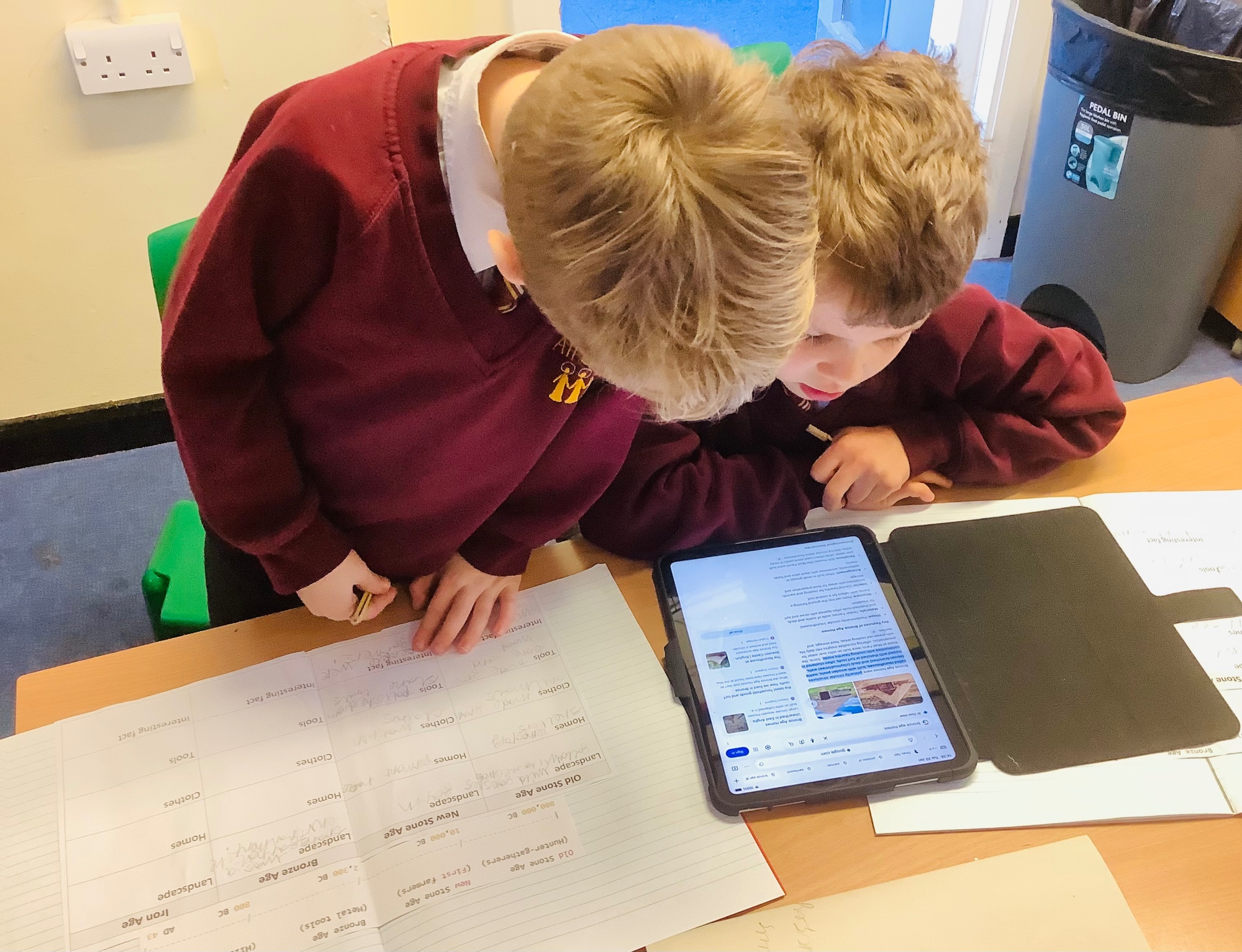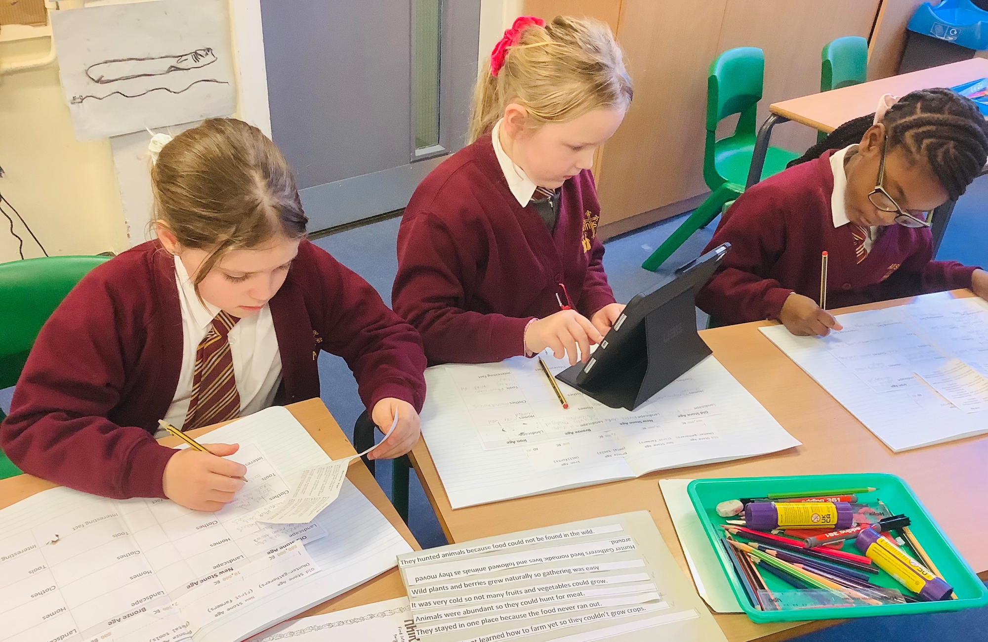 Year 3 have been learning about the Stone Age, exploring the Palaeolithic, Mesolithic and Neolithic periods. They investigated how people lived by researching landscapes, homes, clothes and tools, using timelines to understand how life changed over time. Children also used technology to support their research and deepen their understanding of early human life.