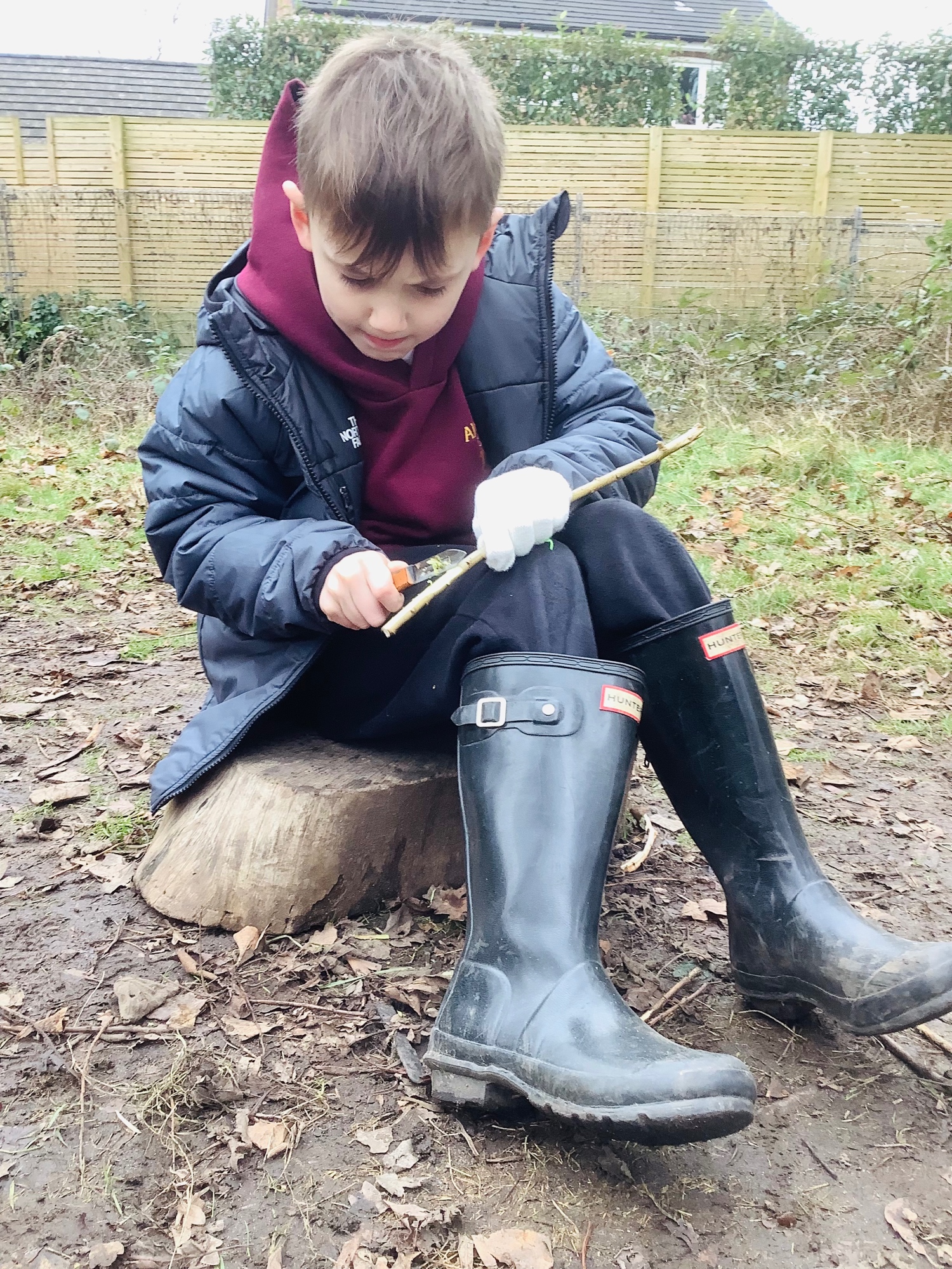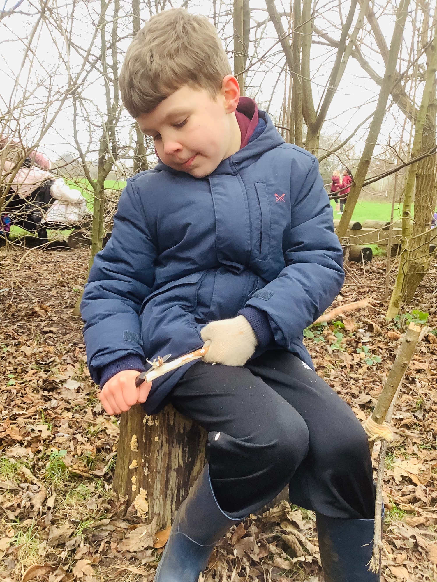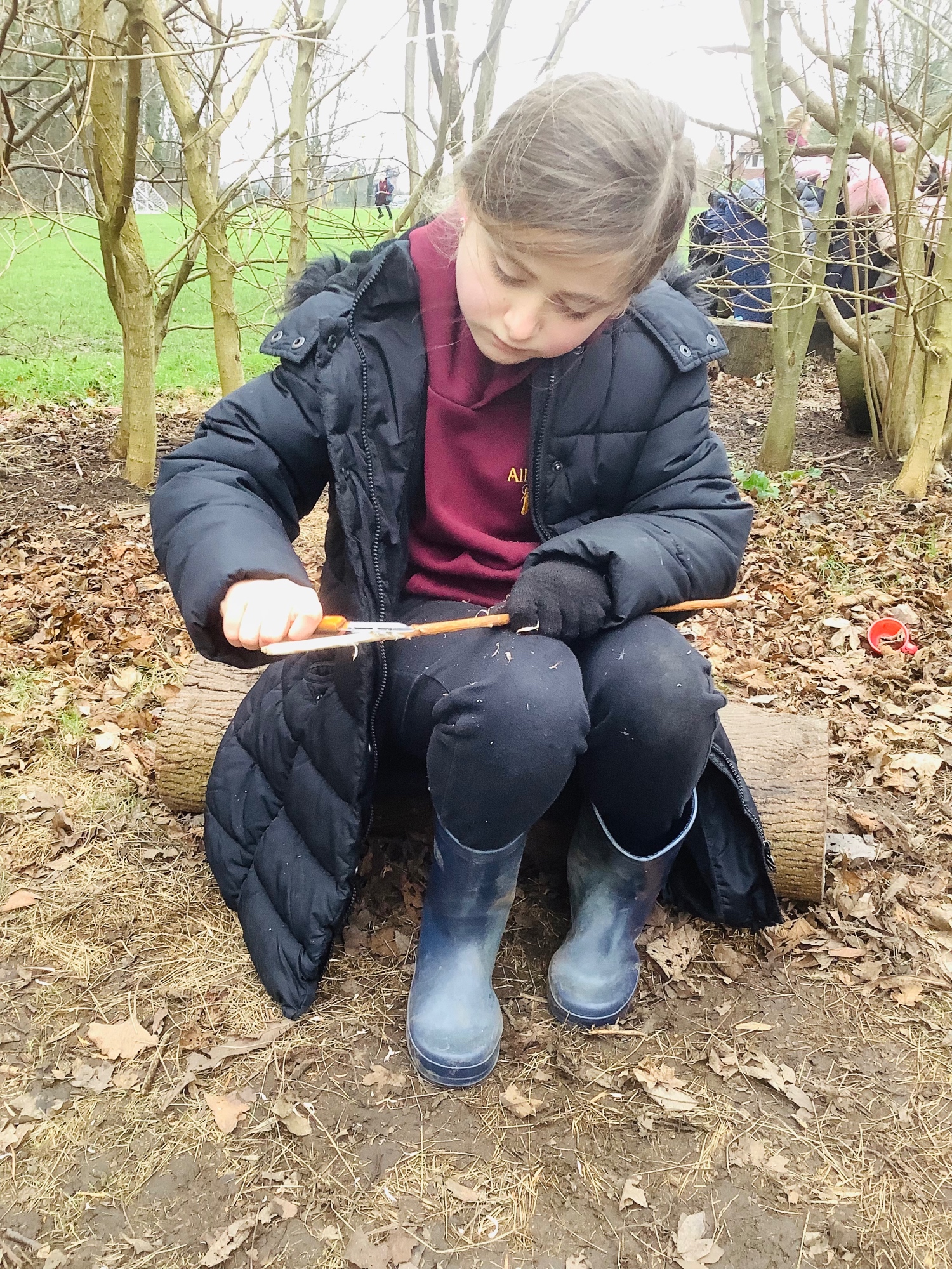 As part of our learning about hunter-gatherers in the Early Stone Age, we made spears at Forest School. We chose a firm stick and carefully used a whittling tool to shape one end into a sharp point.