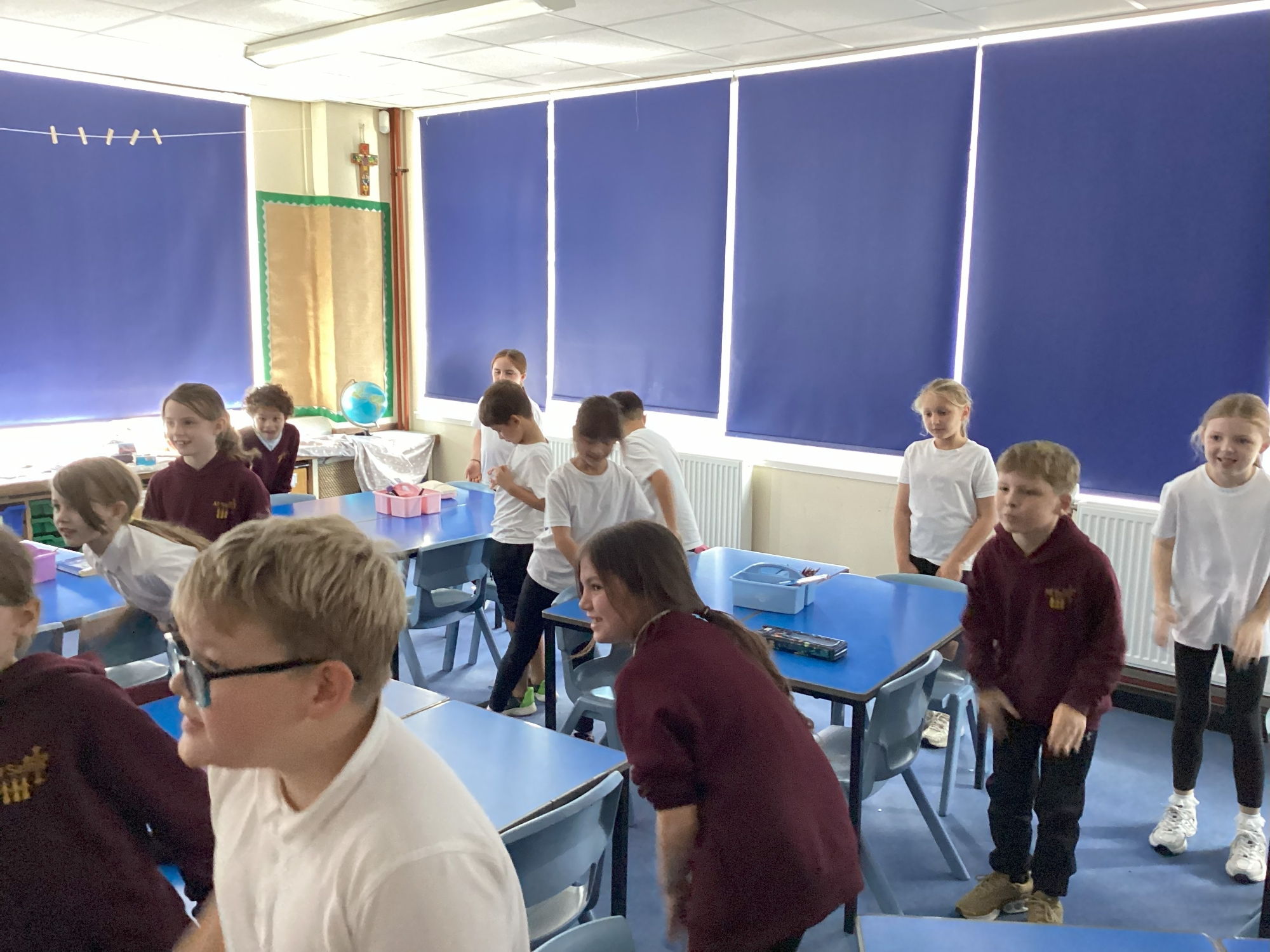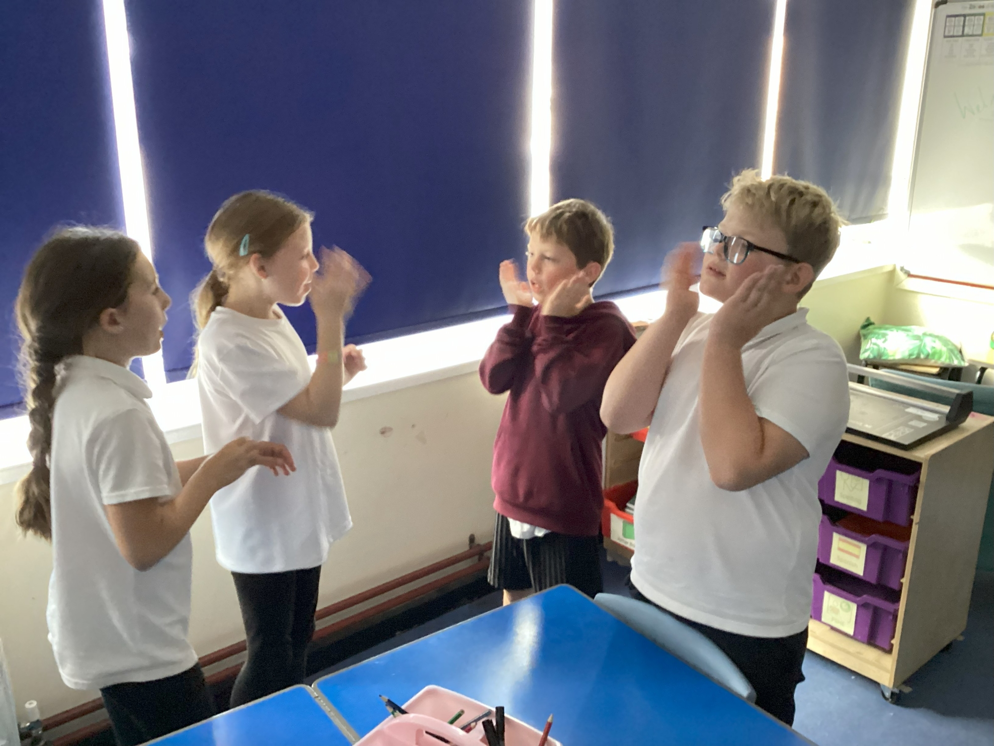 Year 4 are working on a rainforest theme for their music lesson. They are starting to identify the texture and structure of a piece of music, and then they are developing some body percussion based on the Rainforest theme. They are certainly having fun working in groups.