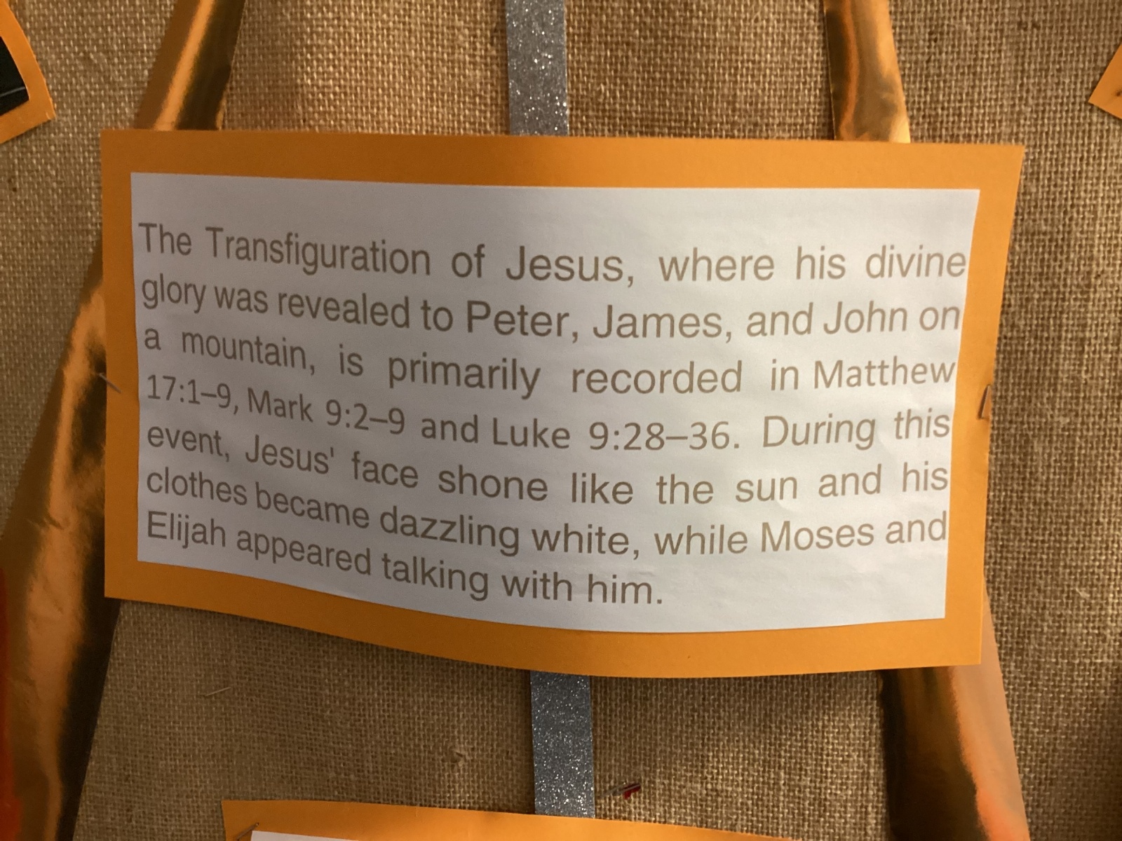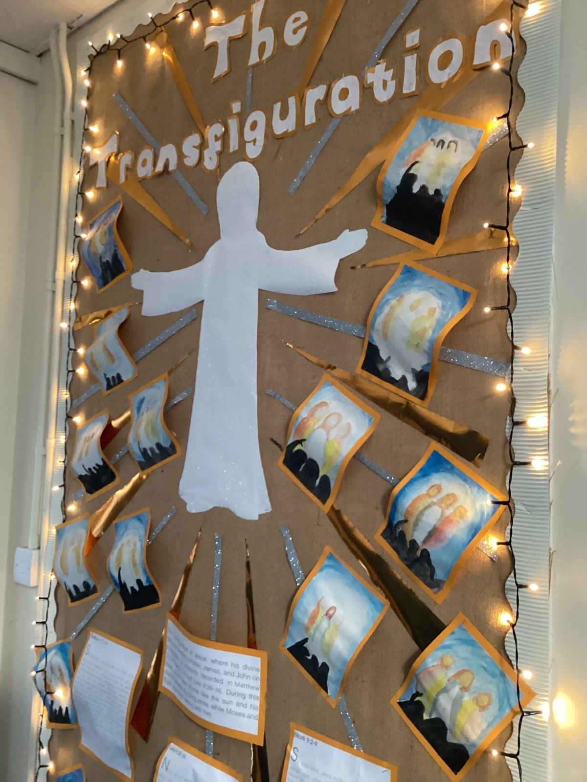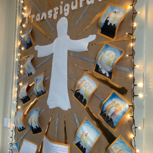In our RE lesson, we have been learning about the Transfiguration of Jesus. This is when Jesus’ appearance became radiant and full of light, showing His divine glory to His disciples. It is important because it helped the disciples understand that Jesus is truly the Son of God and gave them strength to trust Him, even in difficult times. We were inspired by this special event to create a display that reflects light, hope, and faith.