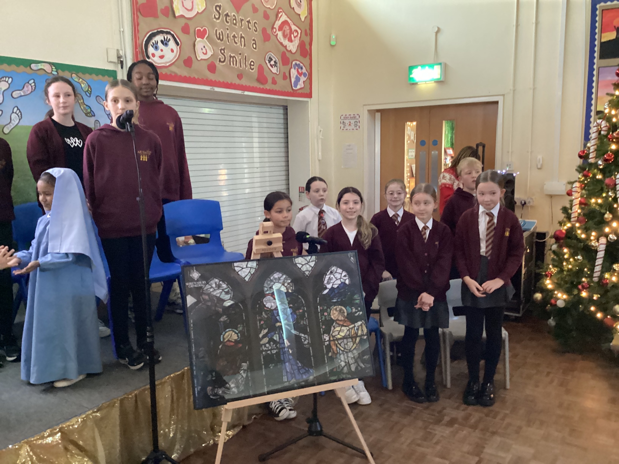 Icons of the Visitation, as represented in the stained-glass window in Shrewsbury Cathedral, will travel on pilgrimage around our Diocese, visiting every school by the end of the Jubilee Year. This week, we welcomed one of theses beautiful icons depicting the Visitation, when Mary travelled ‘with haste’ to help her cousin Elizabeth, soon to give birth to her first child.