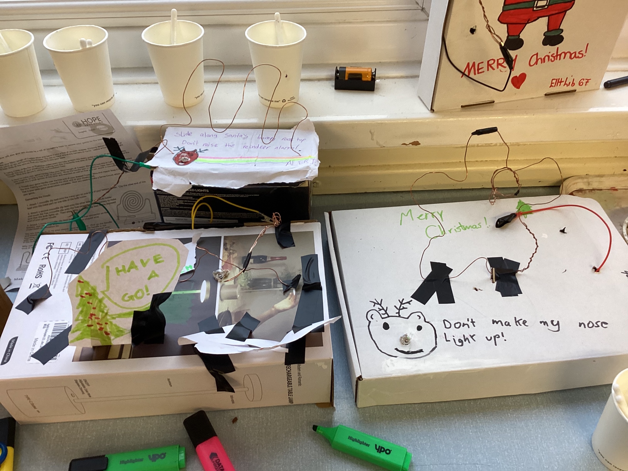 Year 6 took part in a Design & Technology project that combined scientific understanding with creative design. Their challenge was to design and make a steady hand game for younger children, focusing on developing fine motor skills, concentration and hand–eye coordination. The project was closely linked to the National Curriculum outcomes for Design & Technology and Science, particularly learning about simple electrical circuits. Many of the games to be shared with our buddies in Reception were themed around Christmas.