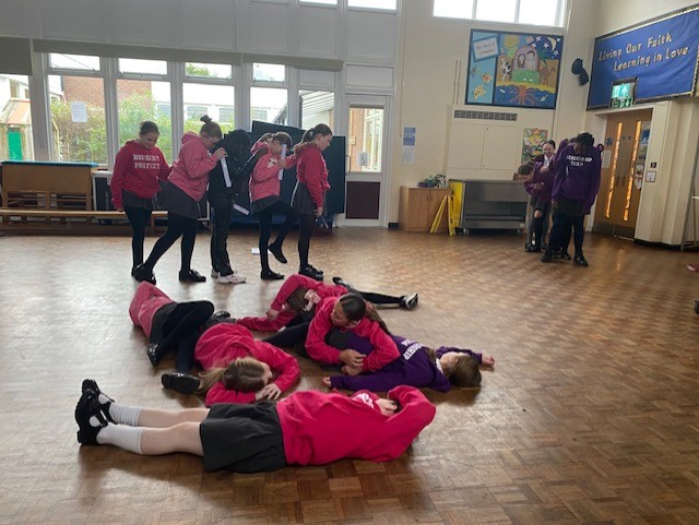 To deepen their understanding, the children used drama techniques including freeze frames, role play, and thought-tracking. They carefully studied the body language, facial expressions, and positioning of the figures in the painting before recreating the scene themselves in the school hall. This helped them think about what the soldiers might have been feeling, seeing, and thinking in that moment.