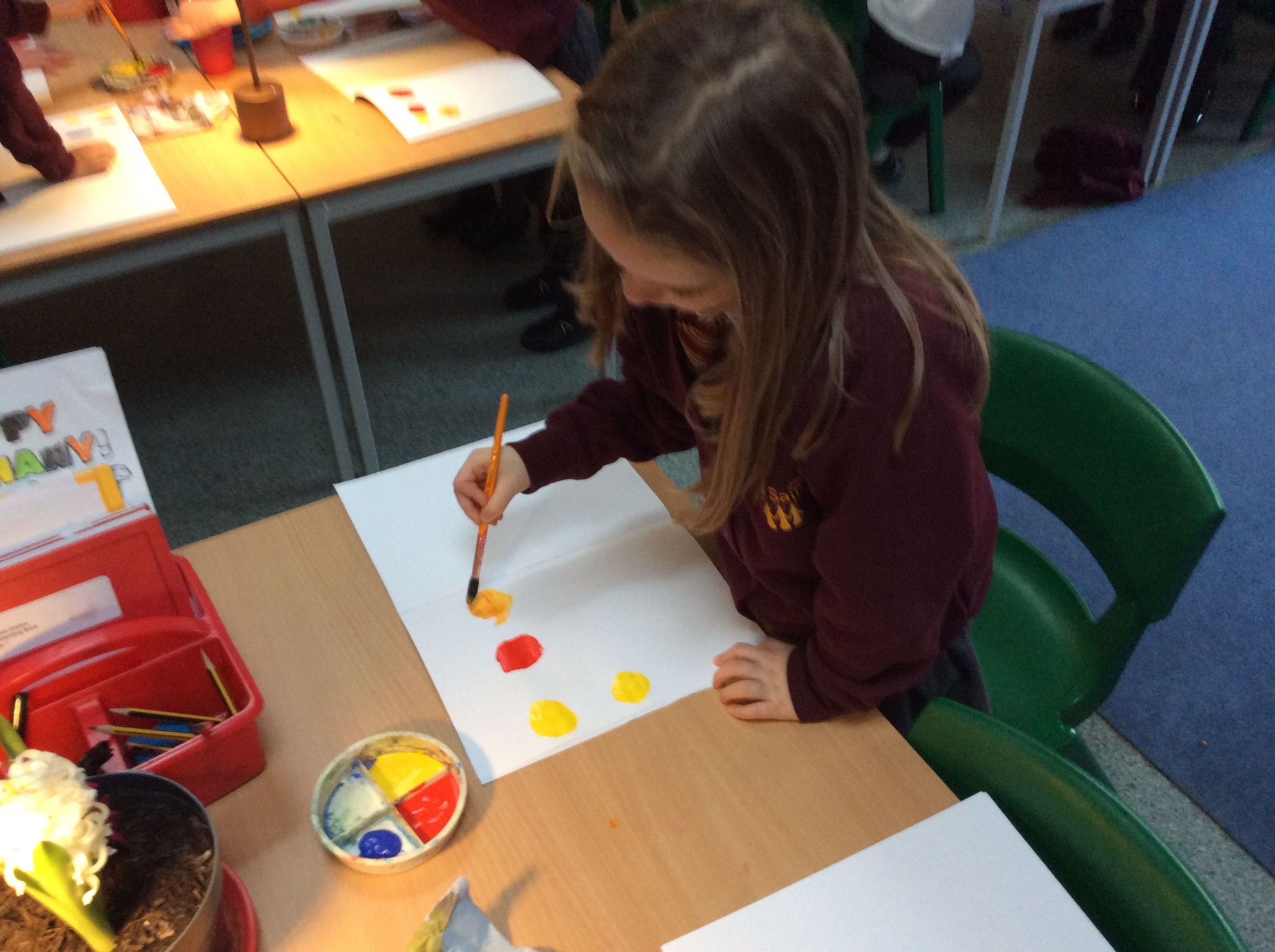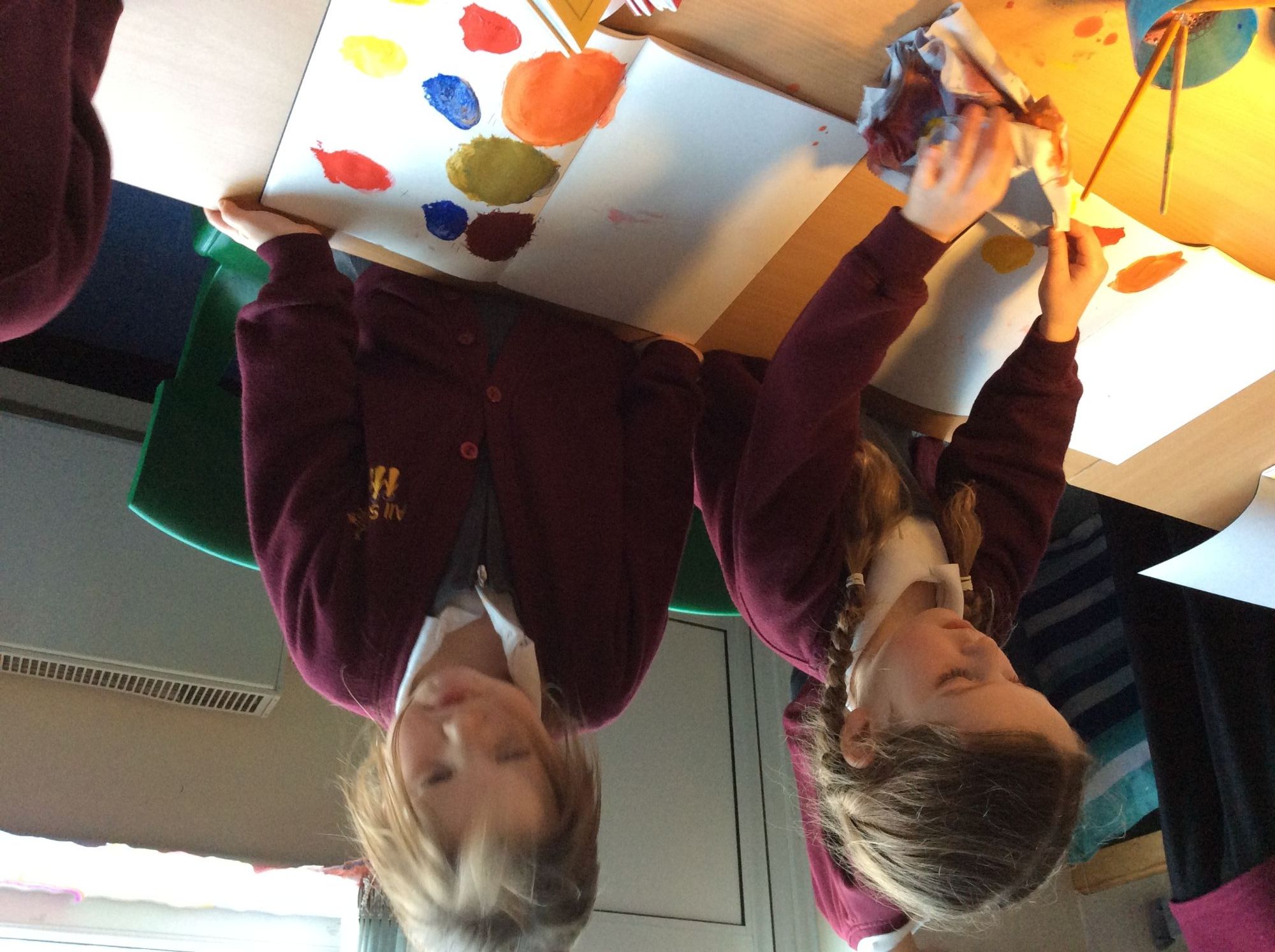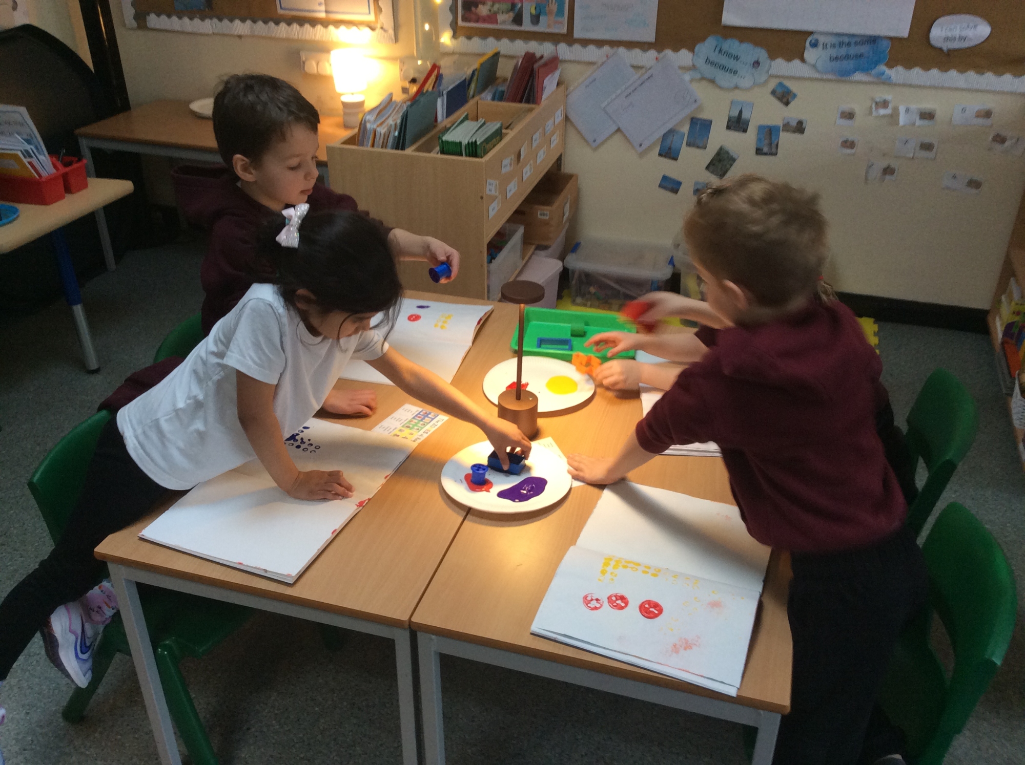 This week in art we used poster paints to create our secondary colour mixing chart. We also added in a little maths talking about how we have made an addition sentence.