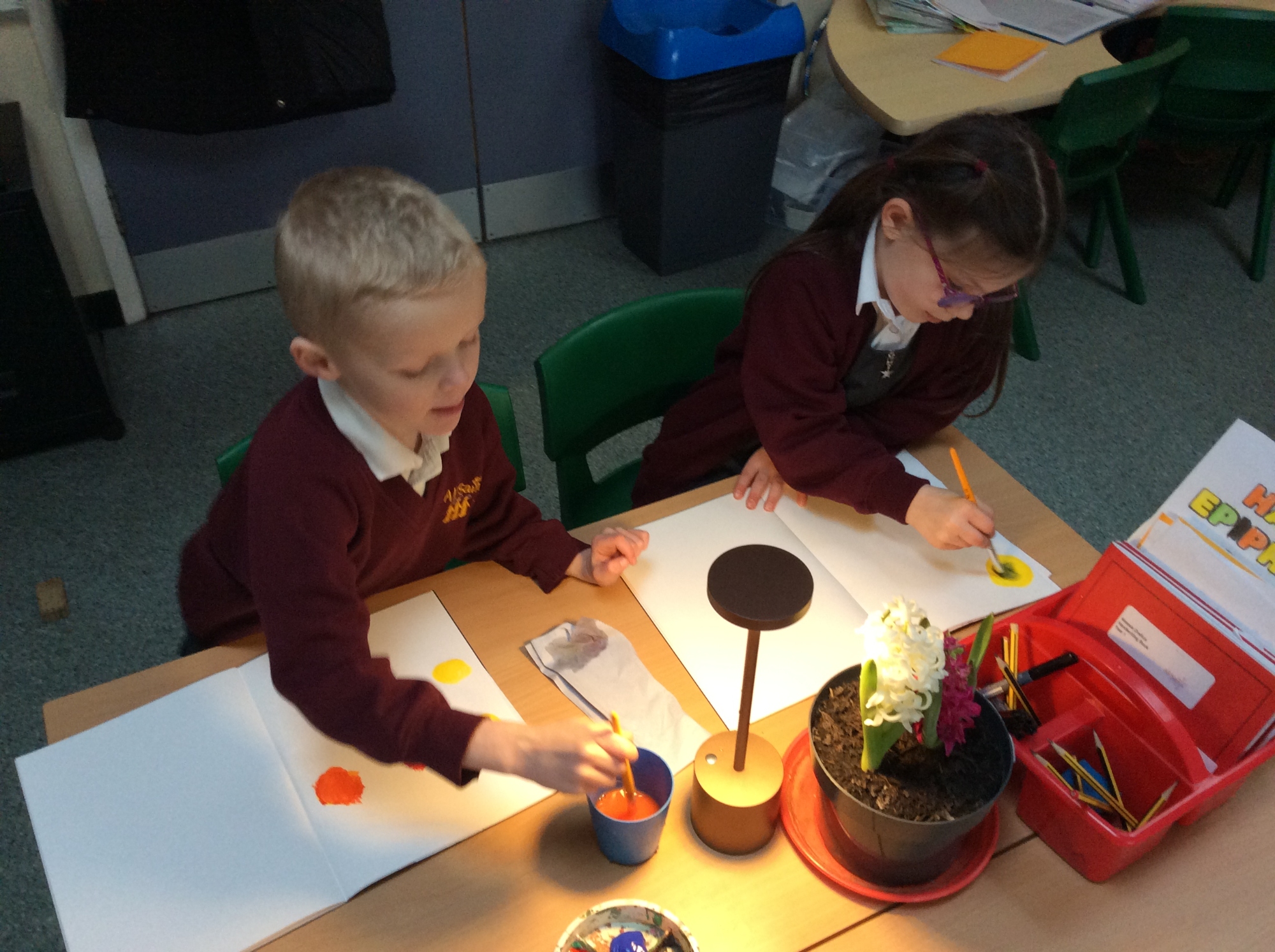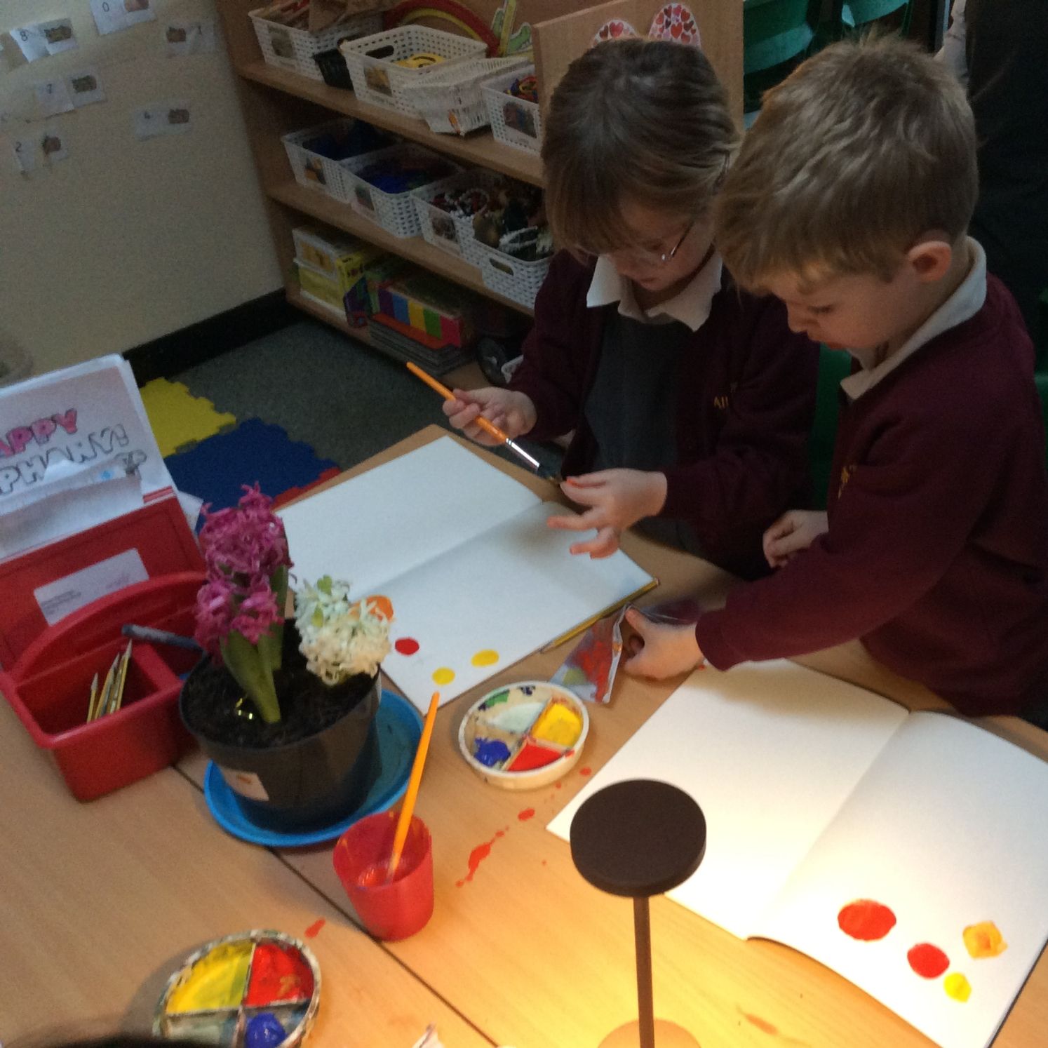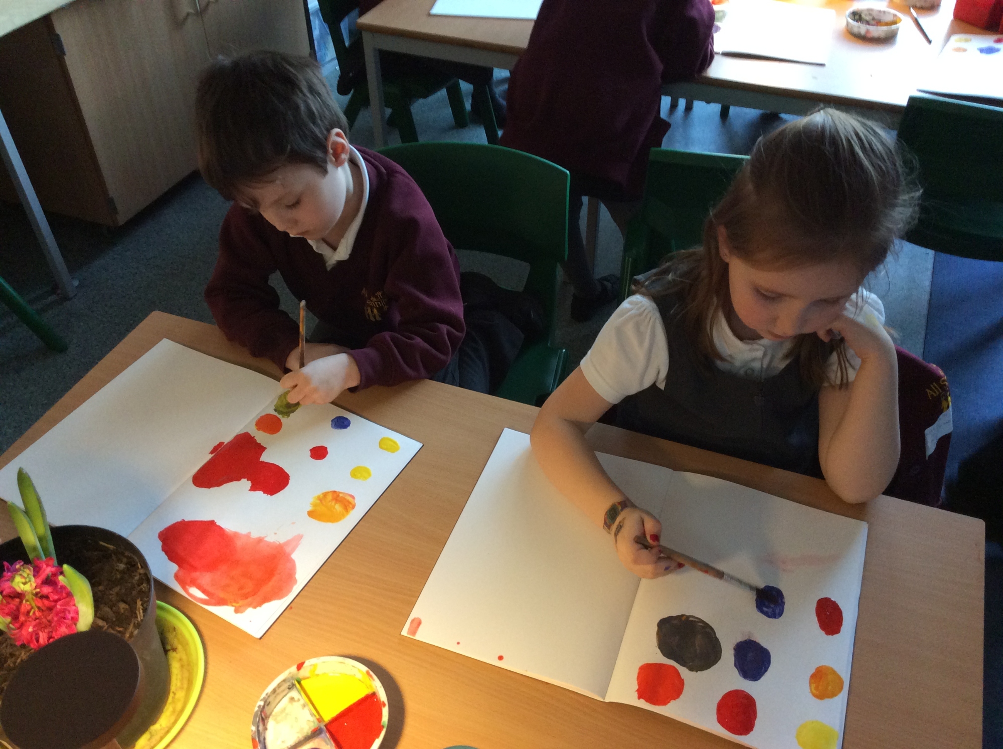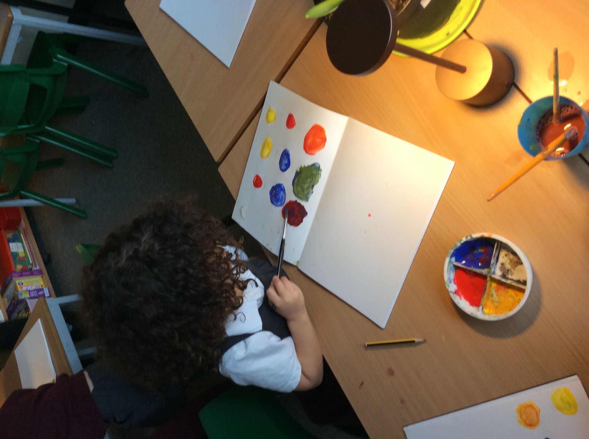 This week in art we used poster paints to create our secondary colour mixing chart. We also added in a little maths talking about how we have made an addition sentence.
