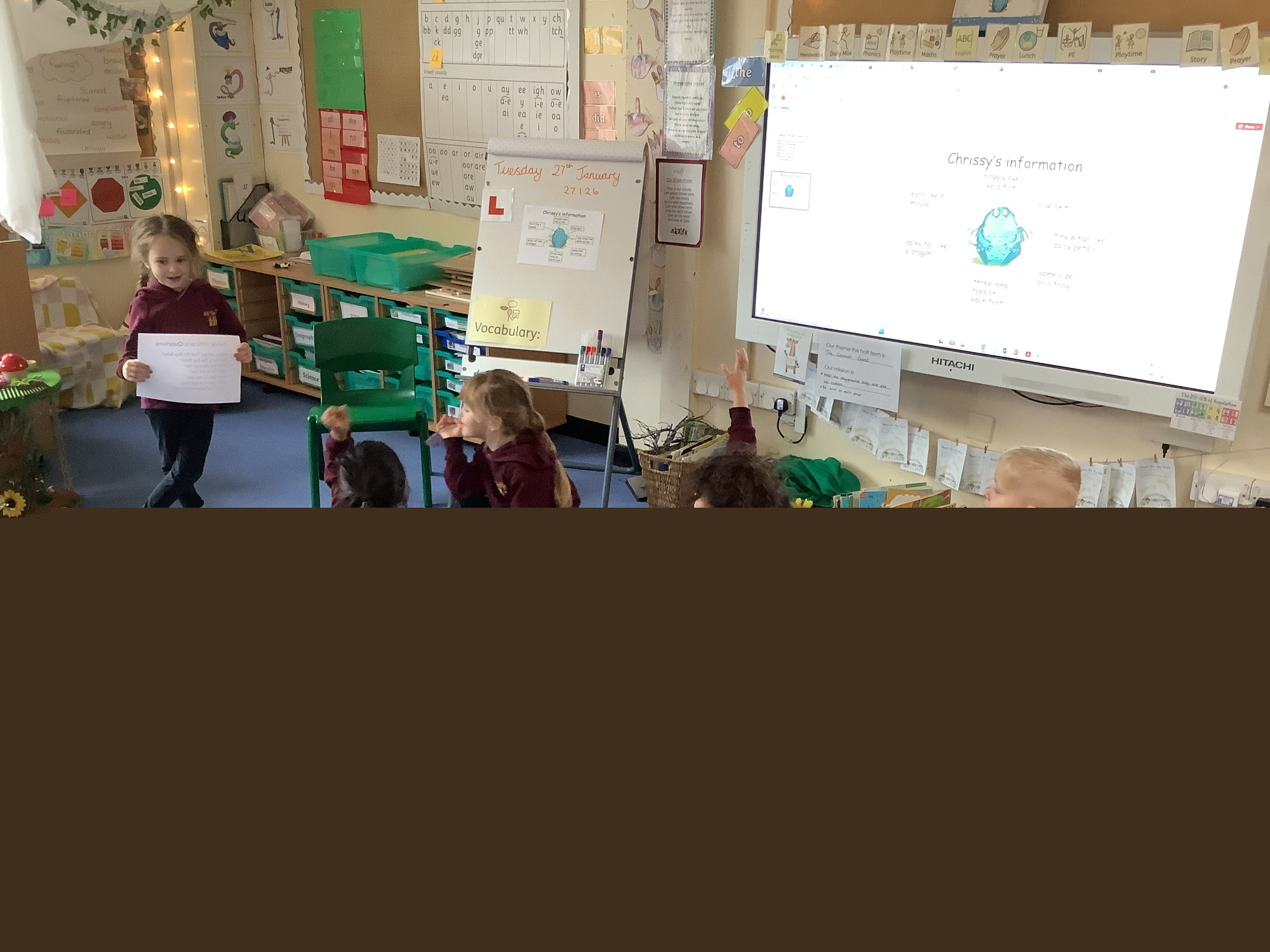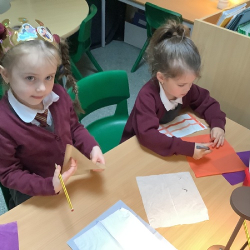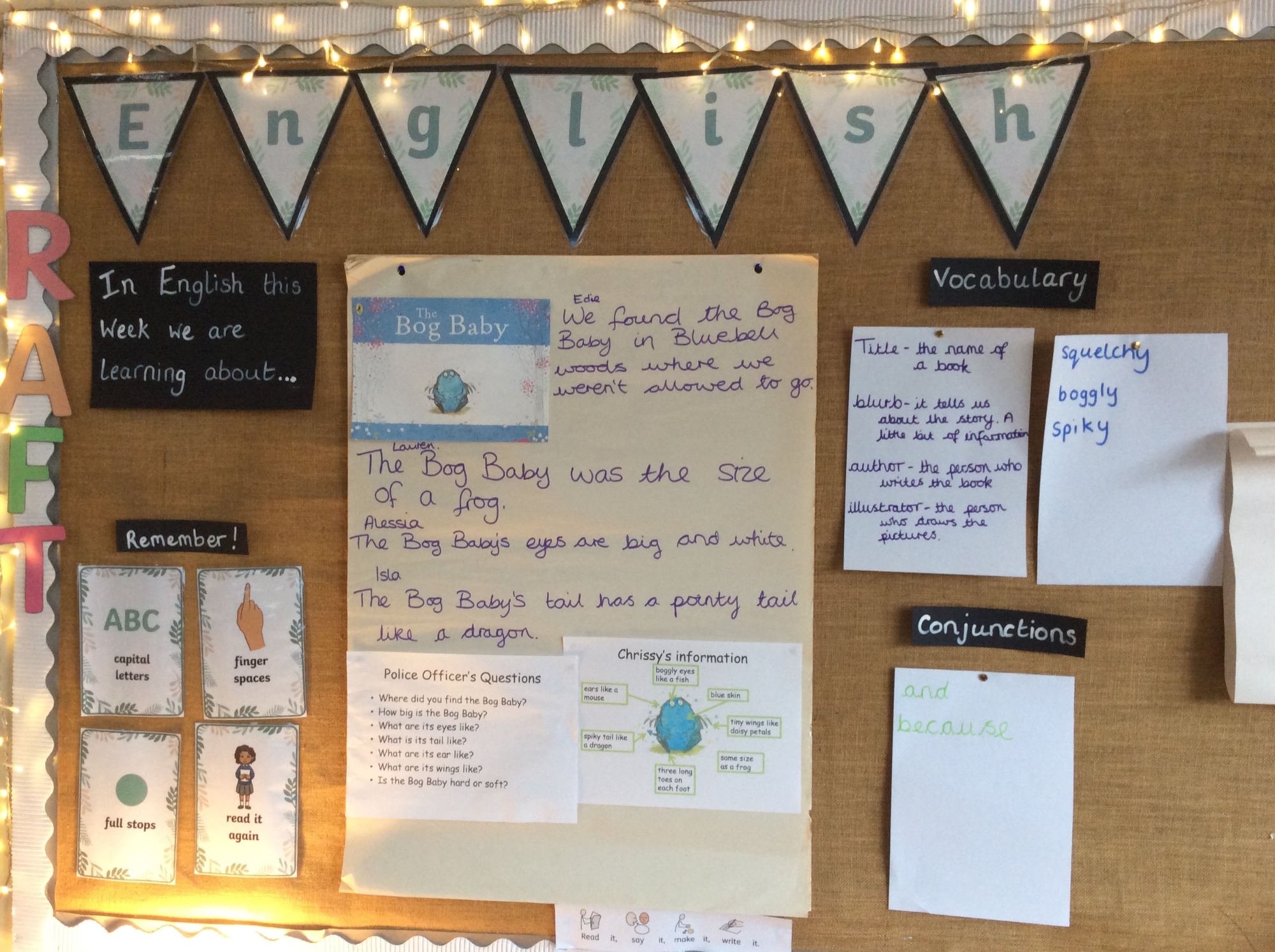 We have been reading the story 'The Bog Baby' in class. We have looked at using our capital letters, finger spaces and full stops in our writing. We had our very own class PC asking eyewitnesses questions about the events of the story. We looked at the suffix 'ed' and talked about past and present tense. The children created their own Bog Babies and used similes to describe them.