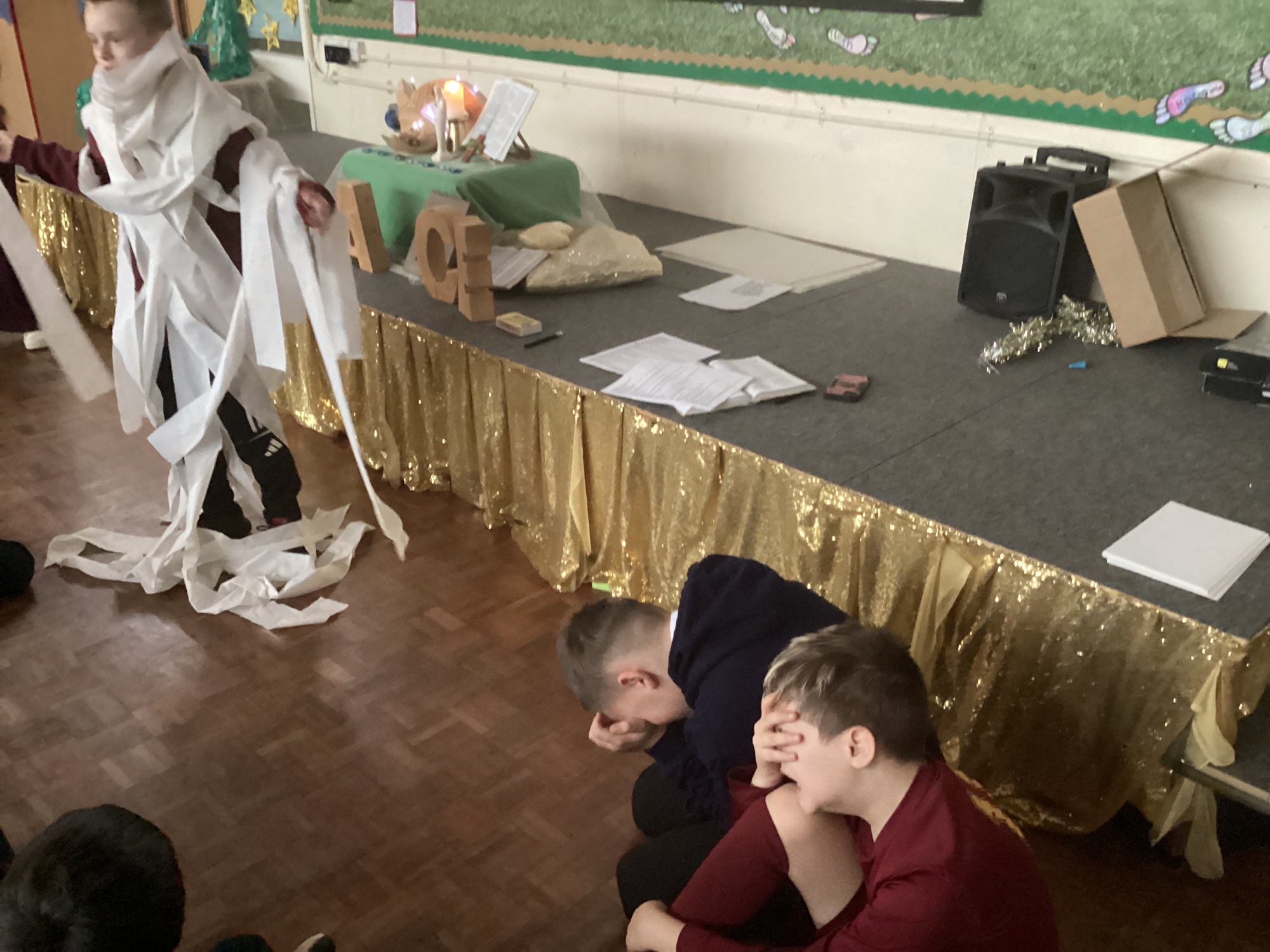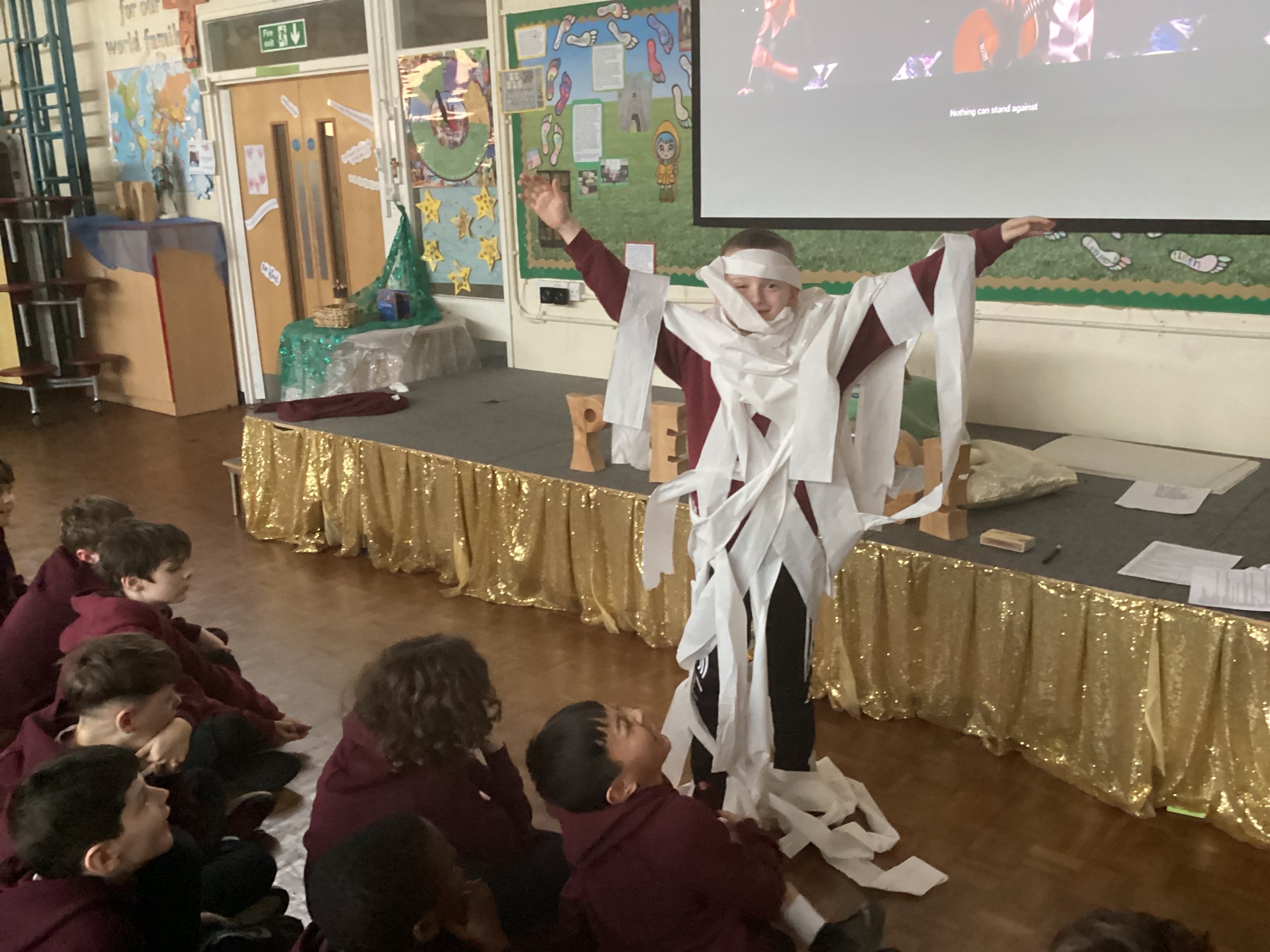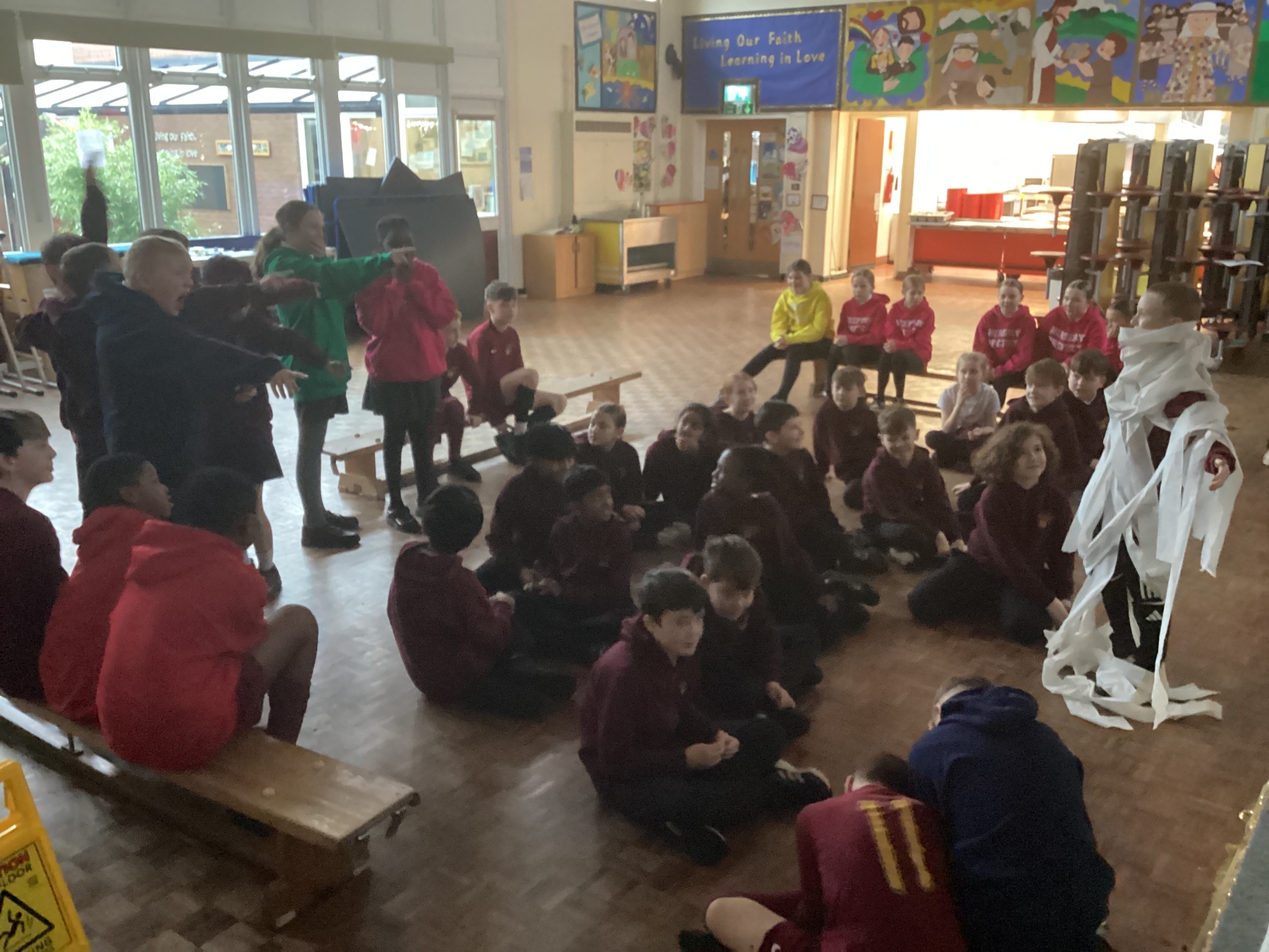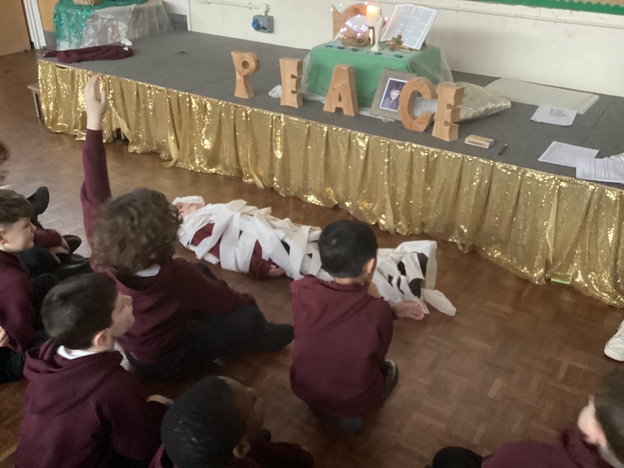 Year 6 joined with Year 5 to learn about the story of Lazarus from the Gospel of John. Together, we explored the events of the story and acted it out to help us understand the emotions and reactions of the people involved, including Mary, Martha and the disciples. Through drama, we reflected on how Jesus showed compassion and love for Lazarus and his family.