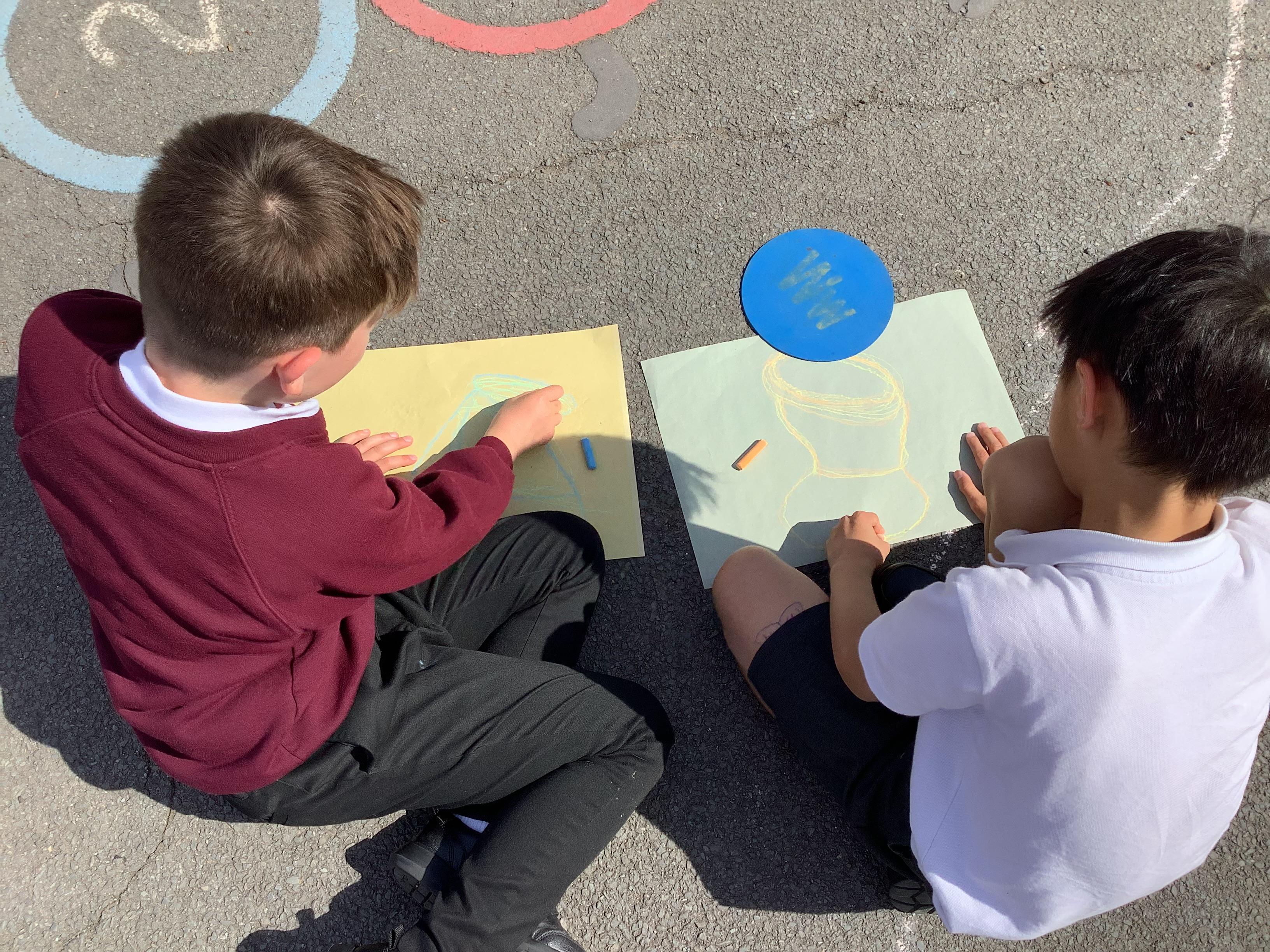 We looked at the work of Magdalene Odundo and used chalk to draw one of her famous pots. The children played around with the shapes and used 2 colours to create new lines on top of shapes they had drawn